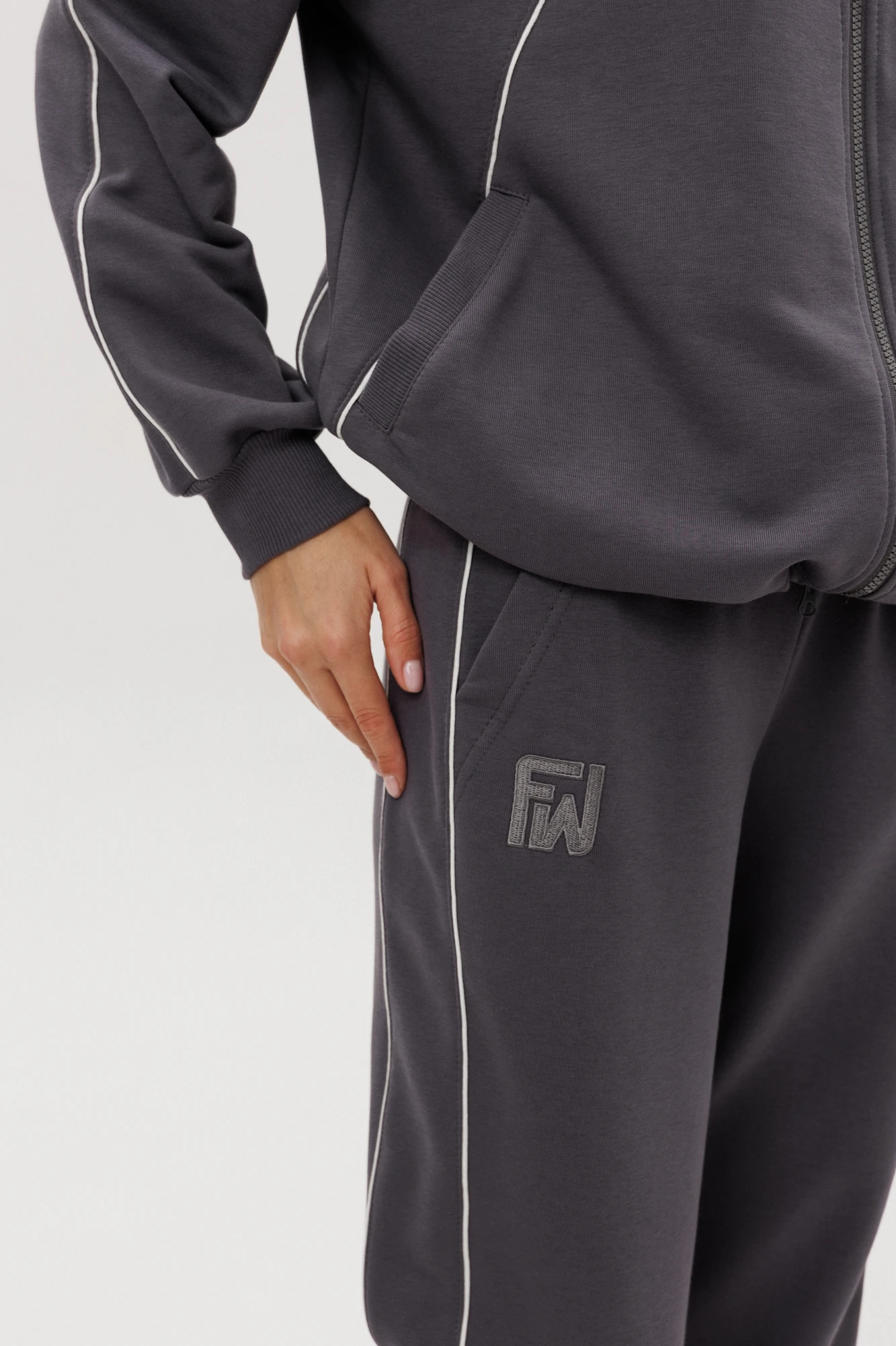 Современный костюм в стиле спорт-кэжуал — идеальный баланс комфорта и актуального дизайна. Модель выполнена из мягкого трикотажного полотна с добавлением хлопка, обеспечивающего приятные тактильные ощущения и свободу движений.