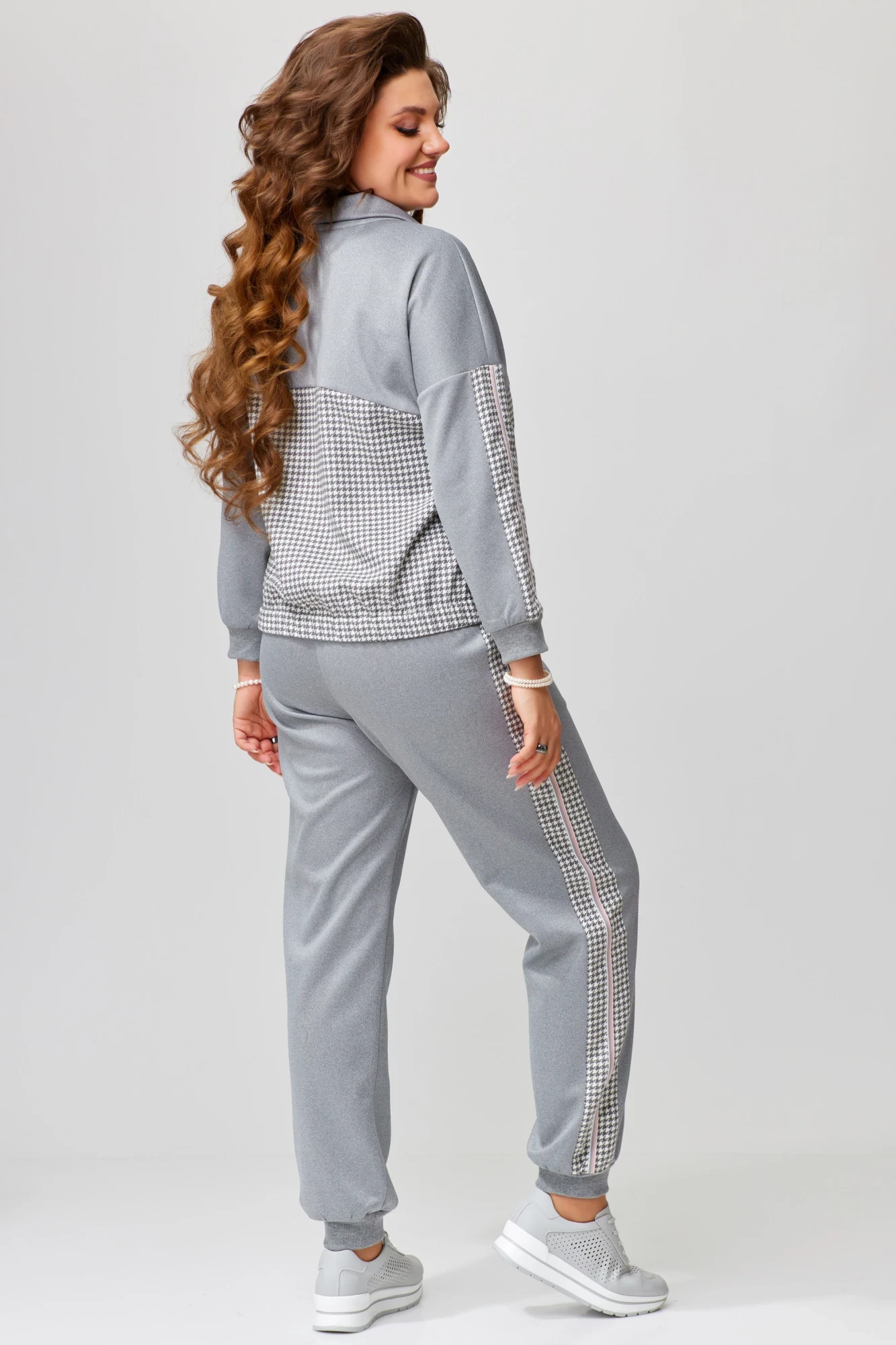 "Женский спортивный комплект ""Васса"" состоит из джемпера и спортивных брюк. Джемпер без подкладки, свободного покроя со спущенным рукавом. Воротник-стойка с застежкой на молнии, по спинке и полочке кокетка из трикотажной ткани, подрезы по спинке и полочке из текстильной ткани с рисунком гусиной лапки. По рукаву вставка из текстильной ткани с настроченной декоративной тесьмой. По низу джемпера резинка, по низу рукава - манжет.