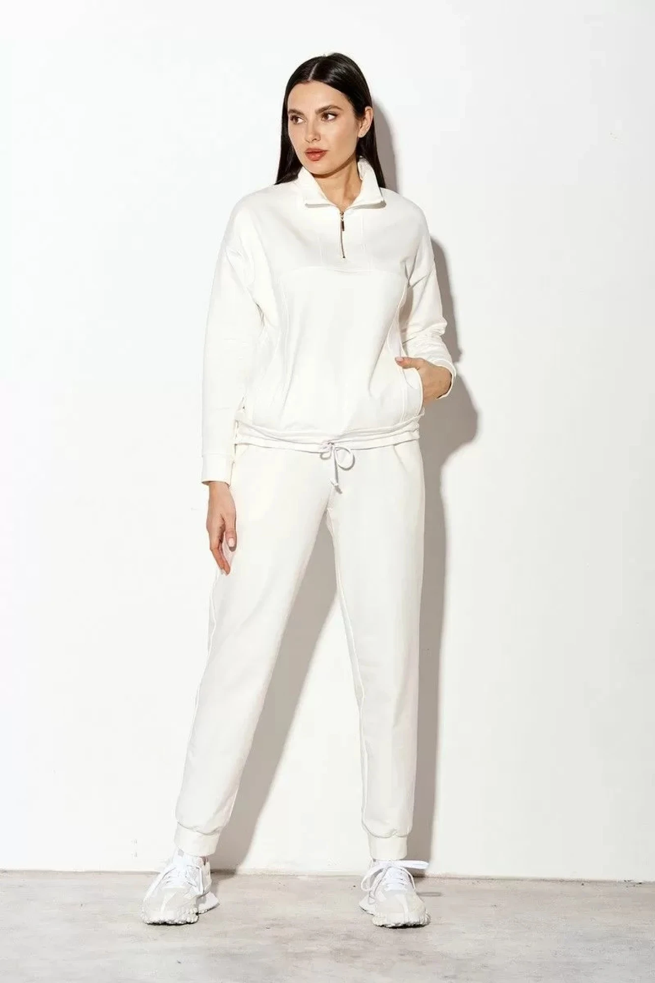 Костюм женский с брюками и джемпером выполнен из хлопкового футера класса "пенье" в спортивном стиле. Джемпер свободного силуэта со спущенной линией плеча и карманами по переду застегивается на молнию, переходящую в воротник-стойку; в притачную планку по низу втавлен декоративный шнур и фиксаторы. Брюки полуприлегающего силуэта с притачным поясом на резинке и карманами в боковых швах дополнены манжетами по низу.