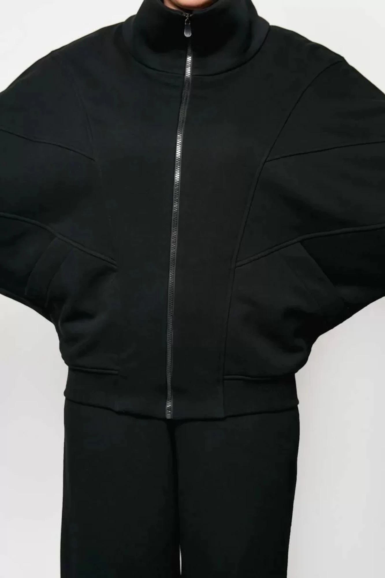 Спортивный женский костюм силуэта оверсайз, состоящий из бомбера на молнии и спортивных брюк, выполнен из высококачественного футера 3-х нитки класса "пенье". Лицевая сторона ткани гладная, изнанка - петлеобразная. Бомбер свободного силуэта с рукавами "летучая мышь" и функциональными карманами по переду застегивается на молнию. Низ бомбера и рукавов выполнены из трикотажного полотна в рубчик (резинка) "кашкорсе" в тон основной ткани. Брюки (спортивные штаны) свободного силуэта с функционалСпортивный женский костюм силуэта оверсайз, состоящий из бомбера на молнии и спортивных брюк, выполнен из высококачественного футера 3-х нитки класса "пенье". Лицевая сторона ткани гладная, изнанка - петлеобразная. Бомбер свободного силуэта с рукавами "летучая мышь" и функциональными карманами по переду застегивается на молнию. Низ бомбера и рукавов выполнены из трикотажного полотна в рубчик (резинка) "кашкорсе" в тон основной ткани. Брюки (спортивные штаны) свободного силуэта с функциональными карманами в боковых швах расширяются к низу, пояс брюк полностью на резинке.