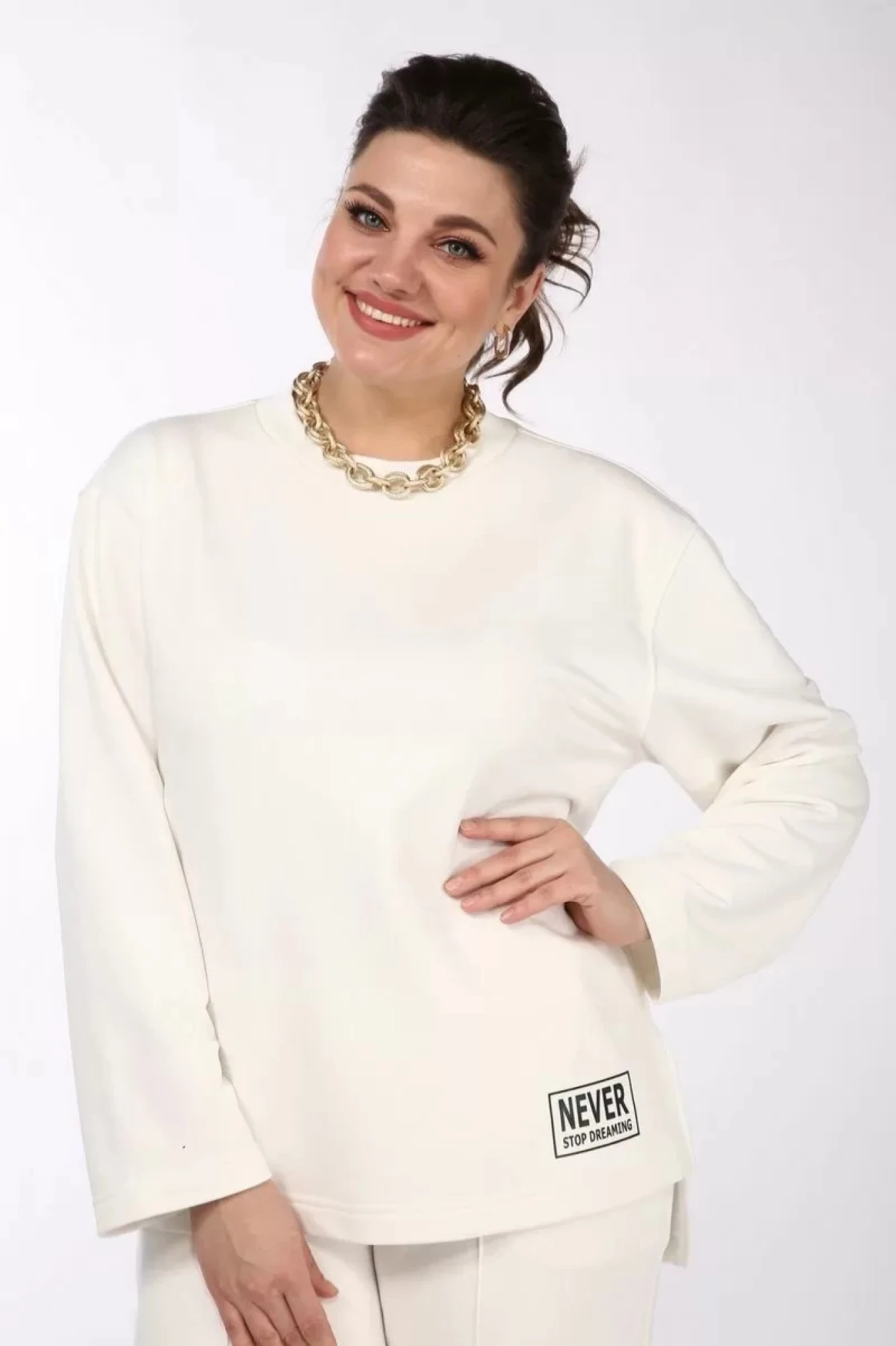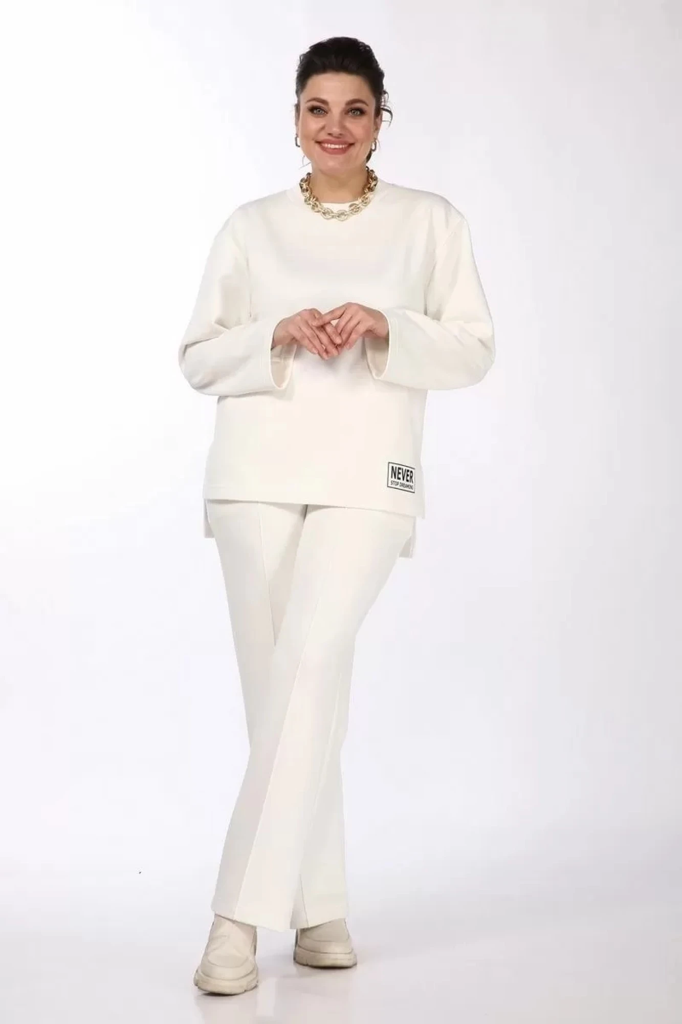 Костюм женский, состоящий из джемпера и брюк прямого свободного силуэта, изготовленный из трикотажного полотна (футер 3-х нитка петля). Джемпер прямого свободного силуэта со спущенной линией плеча, округлым вырезом горловины, по боковым швам - разрезы, слева внизу декоративная печать. Рукава втачные, прямые. Спинка джемпера без конструктивных изменений. Линия низа спинки длиннее линии низа переда на 8см. Брюки прямого свободного силуэта с высокой посадкой и наклонными карманами в боковых швах. Пояс брюк на широкой резинке. По переднему полотнищу брюк – отделочная строчка, которая вытягивает силуэт. Длина джемпера - 74см, длина рукава - 57см, ширина плеча - 16см, длина брюк - 112см (с учетом ширины пояса 5см)