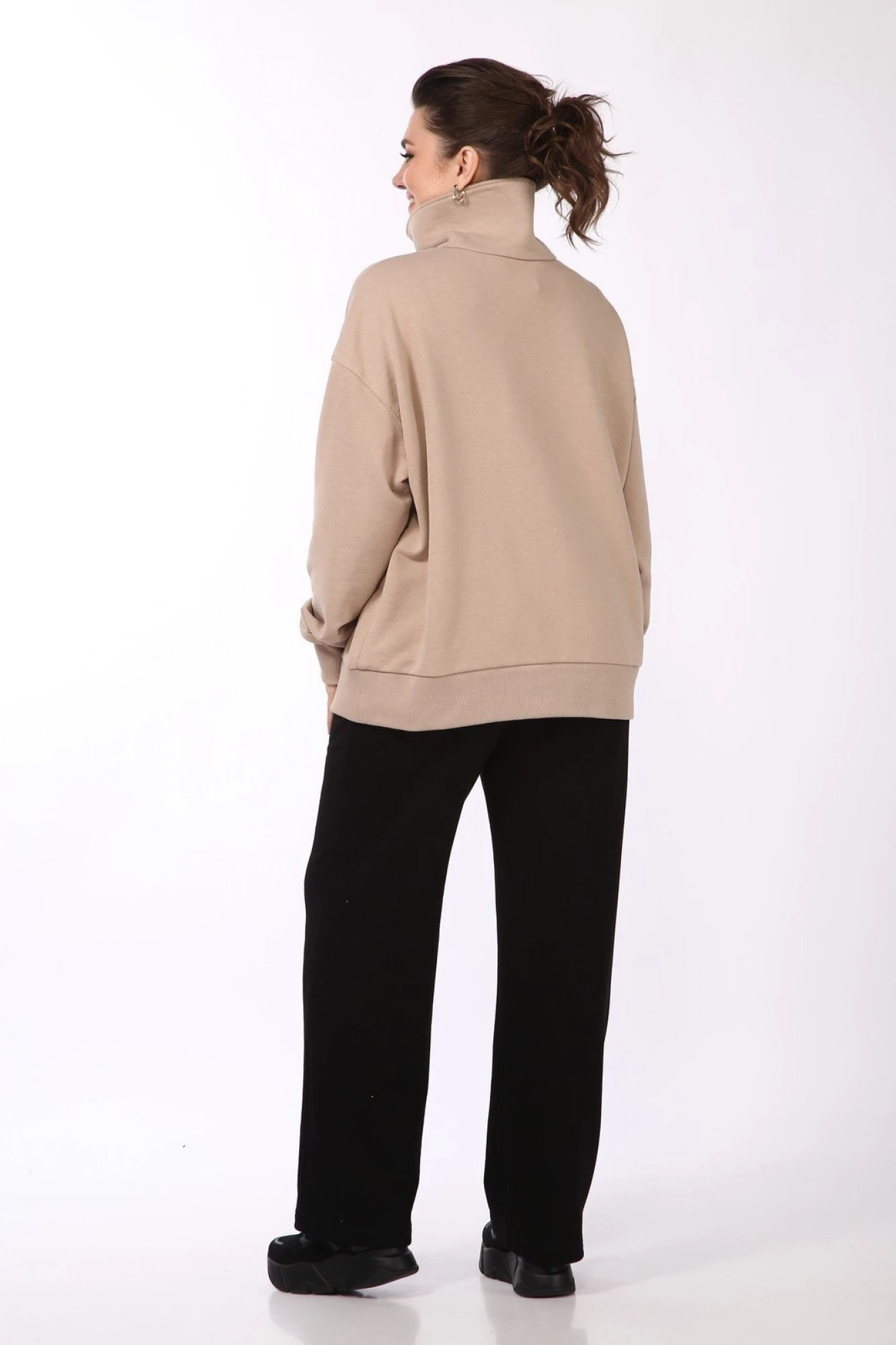 Костюм женский, состоящий из джемпера и брюк прямого свободного силуэта, изготовленный из трикотажного полотна (футер 3-х нитка петля). Джемпер женский, изготовленный из трикотажного полотна (футер 3-х нитка петля) прямого свободного силуэта с горловиной стойкой, высотой 9,5см и застежкой на планку на 4 кнопки, со спущенной линией плеча и манжетой по низу изделия. Рукав втачной с манжетой. Спинка изделия без конструктивных элементов. Брюки прямого свободного силуэта с высокой посадкой и наклонными карманами в боковых швах. Пояс брюк на широкой резинке. По переднему полотнищу брюк – отделочная строчка, которая