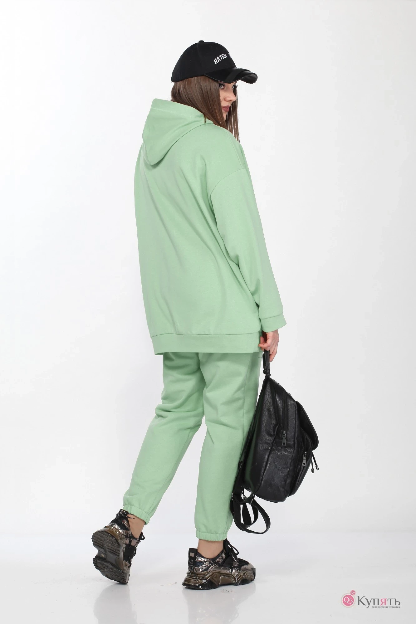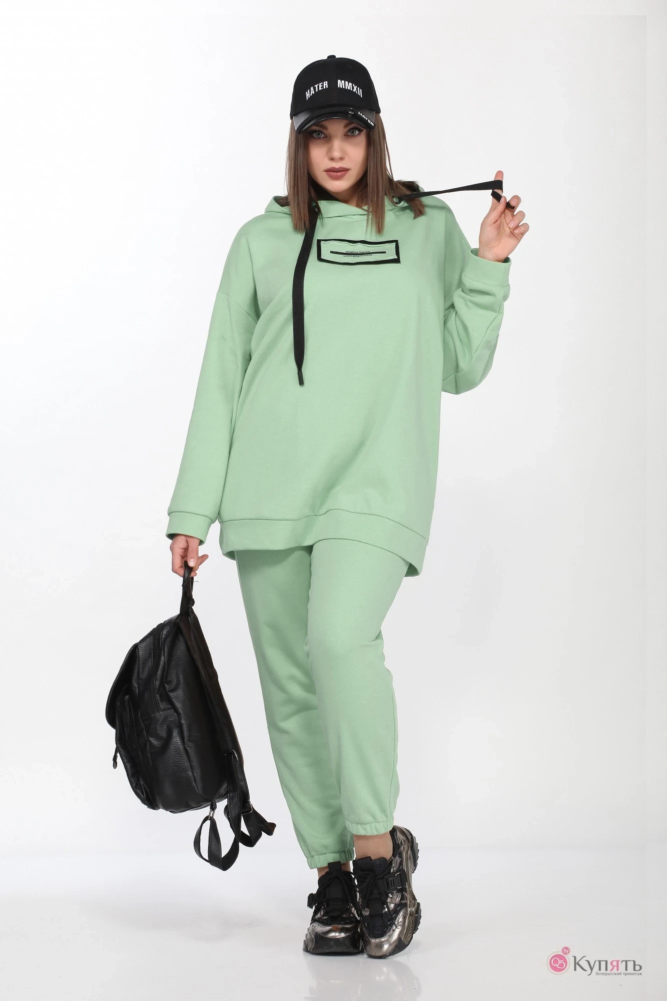 Спортивный костюм из трикотажного хлопкового полотна “трехнитка”. Удлинённый джемпер-худи свободного силуэта с капюшоном и прорезными карманами в боковых швах, рукав втачной на спущенной пройме. Брюки свободного силуэта с прорезными карманами в боковых швах, пояс и низ на эластичной ленте со сборкой.