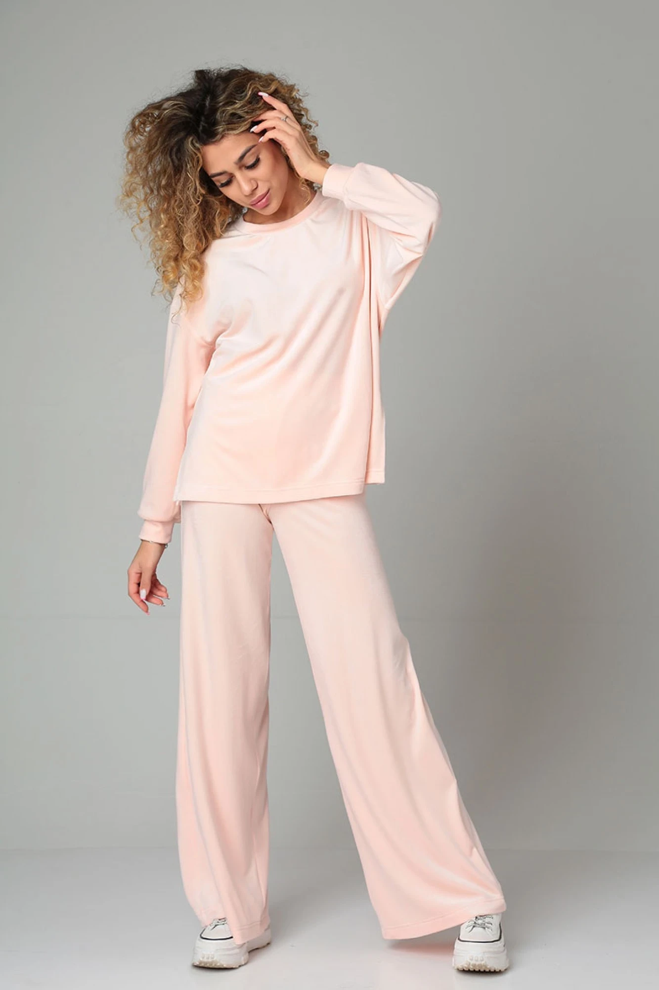 Стильный, мягкий, комфортный костюм из тонкого плюшевого вельвета. Блузон свободного силуэта, рукав втачной на спущенной пройме с манжетой, по бокам разрезы. Брюки свободного силуэта на эластичной ленте.