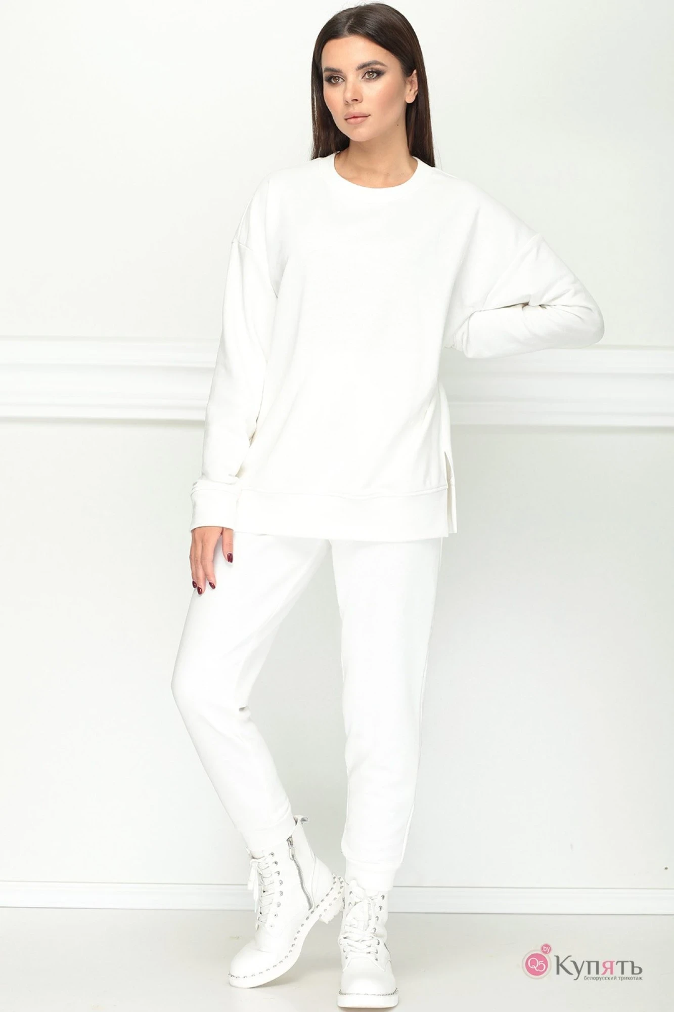Стильный спортивный костюм для занятий спорта и отдыха подарит Вам ощущение комфорта и хорошее настроение. Важно - худи в стиле оверсайз, брючки обычные.Комплект женский, 2-х предметный, состоящий из худи и брюк. Худи прямого силуэта, без капюшона, со спущенной линией плеча. Рукав втачной длинный, вырез горловины округлый. Низ худи, низ рукава, планка горловины обработаны притачной планкой и манжетой из основного материала. В боковых швах имеются разрезы. Брюки на притачном поясе с резинкой по кругу. Задняя половинка брюк без конструктивных особенностей. Передняя половинка брюк с боковыми карманами- хулиганами. Низ брюк с притачным манжетом из основного материала.