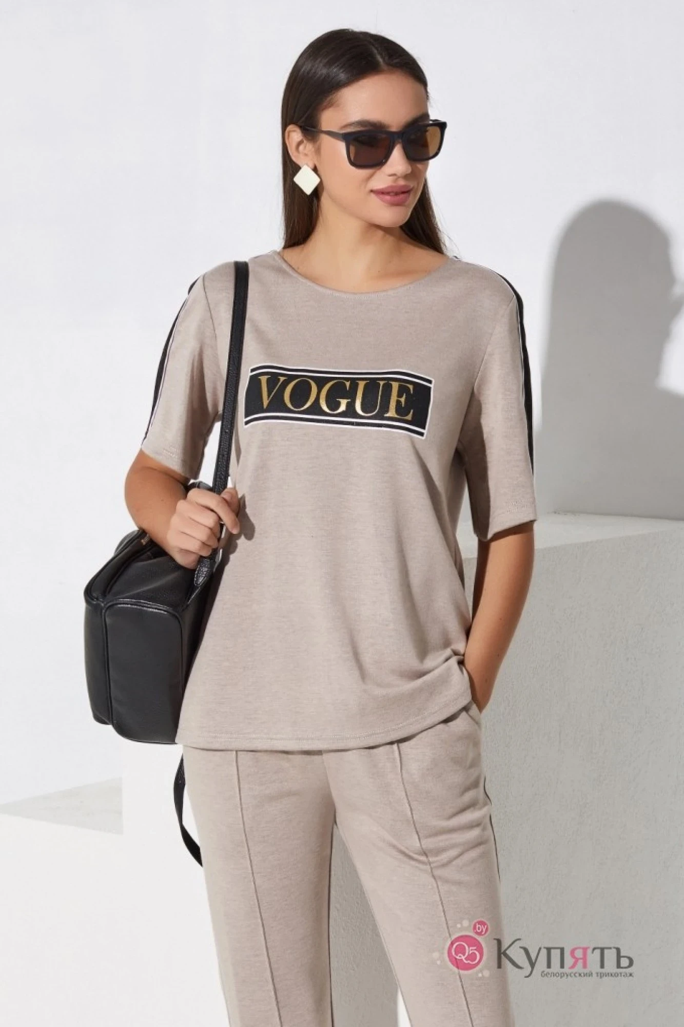 Трендовы костюм из тонкого трикотажа выполнен в стиле «Sport Chic» и «Street Casual». Свитшот с округлым вырезом прямого силуэта свободного кроя с короткими рукавами один из главных трендов сезона. Перед свитшота украшен авторской печатью. Линия плеча немного приспущена, от горловины вдоль плечевого шва и до низа рукака вставка из контрастного однотона с узкой белой отделкой. Спинка цельная. Трикотажные брюки средней посадки с косыми карманами, пояс выполнен из трикотажной рельефной резинки.