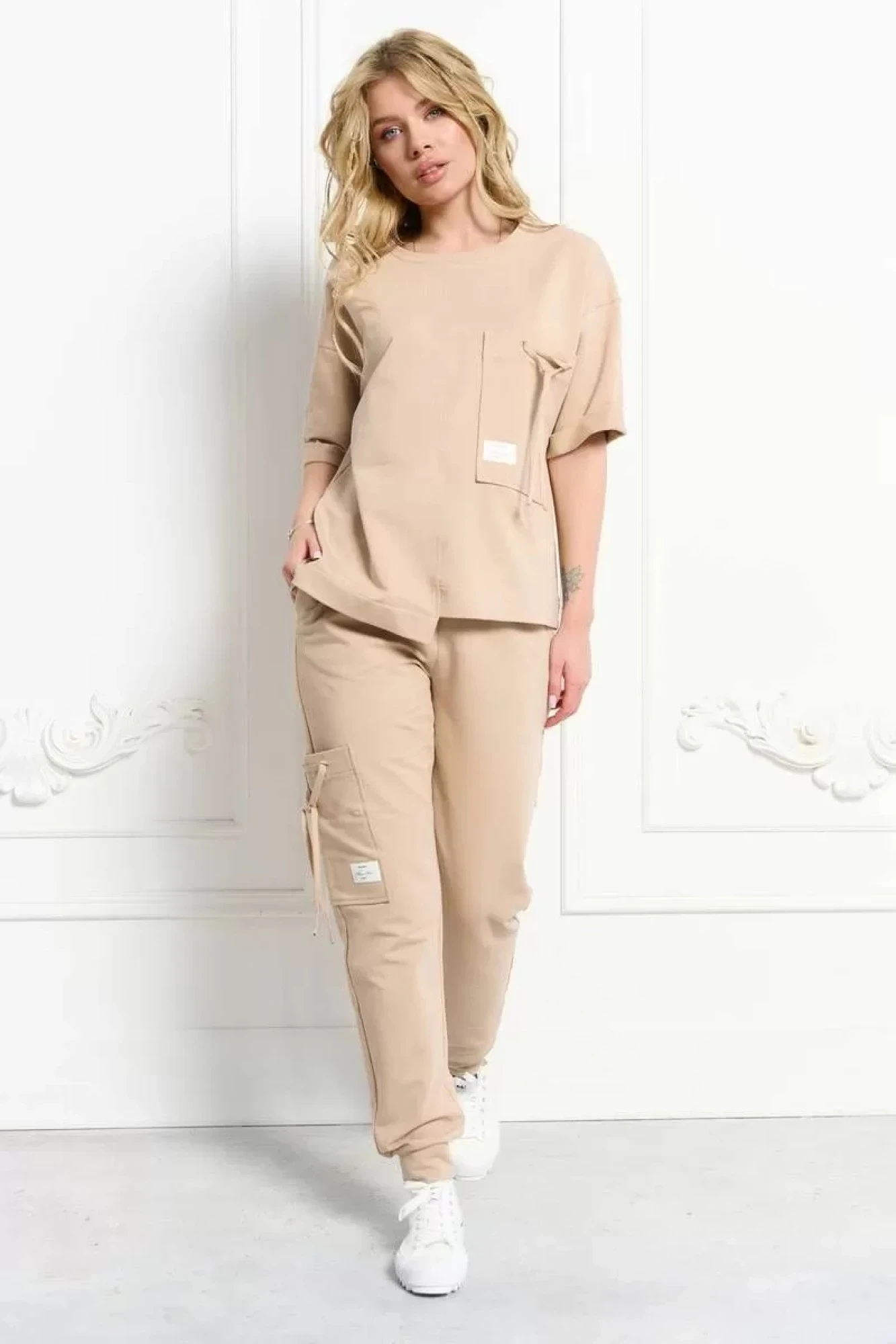 Брюки свободного кроя с боковыми карманами. Пояс притачной на резинке. Низ на притачной манжете. На правой половинке брюк на боковом шве — декоративный карман.