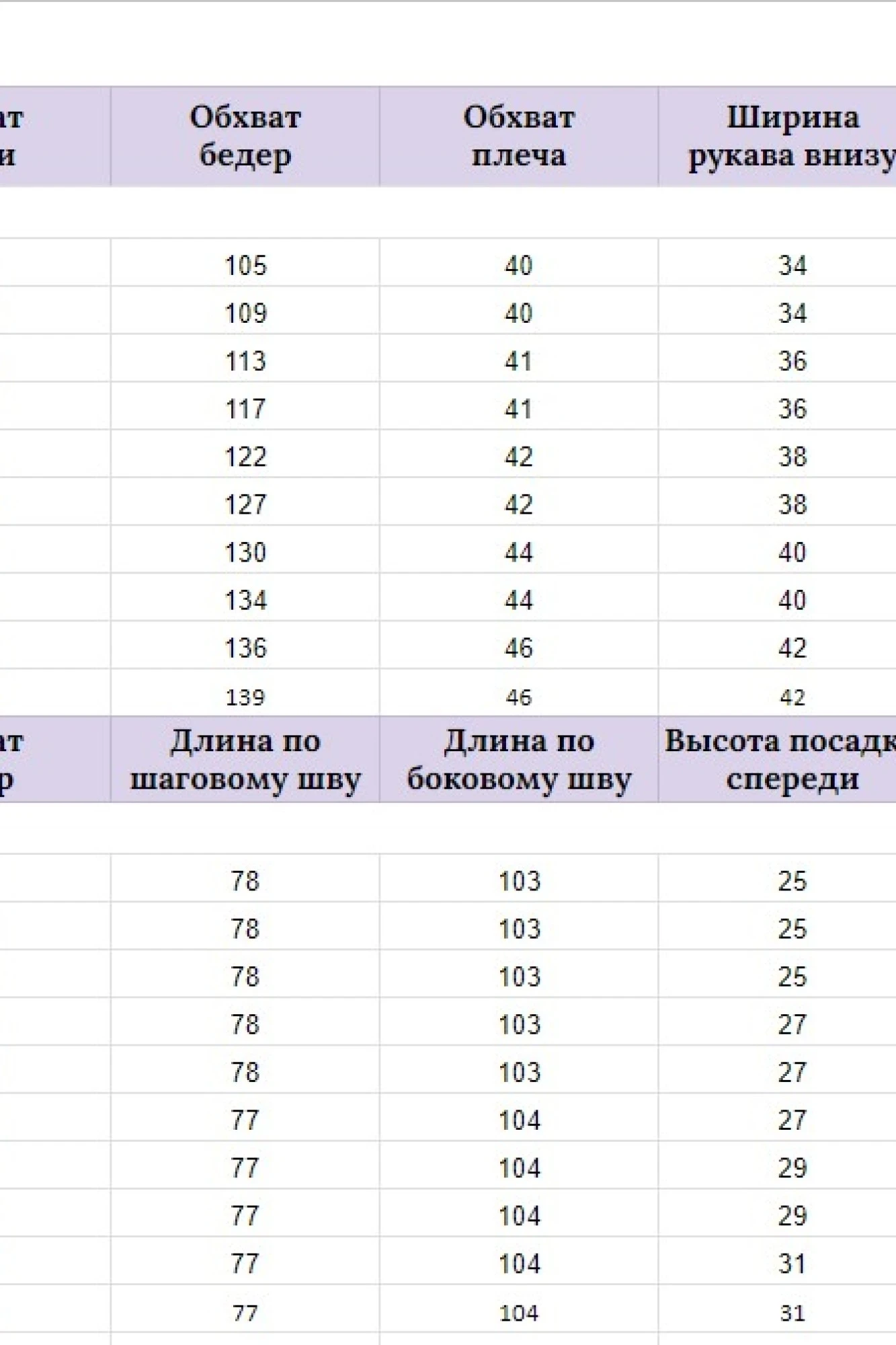 Таблица размеров