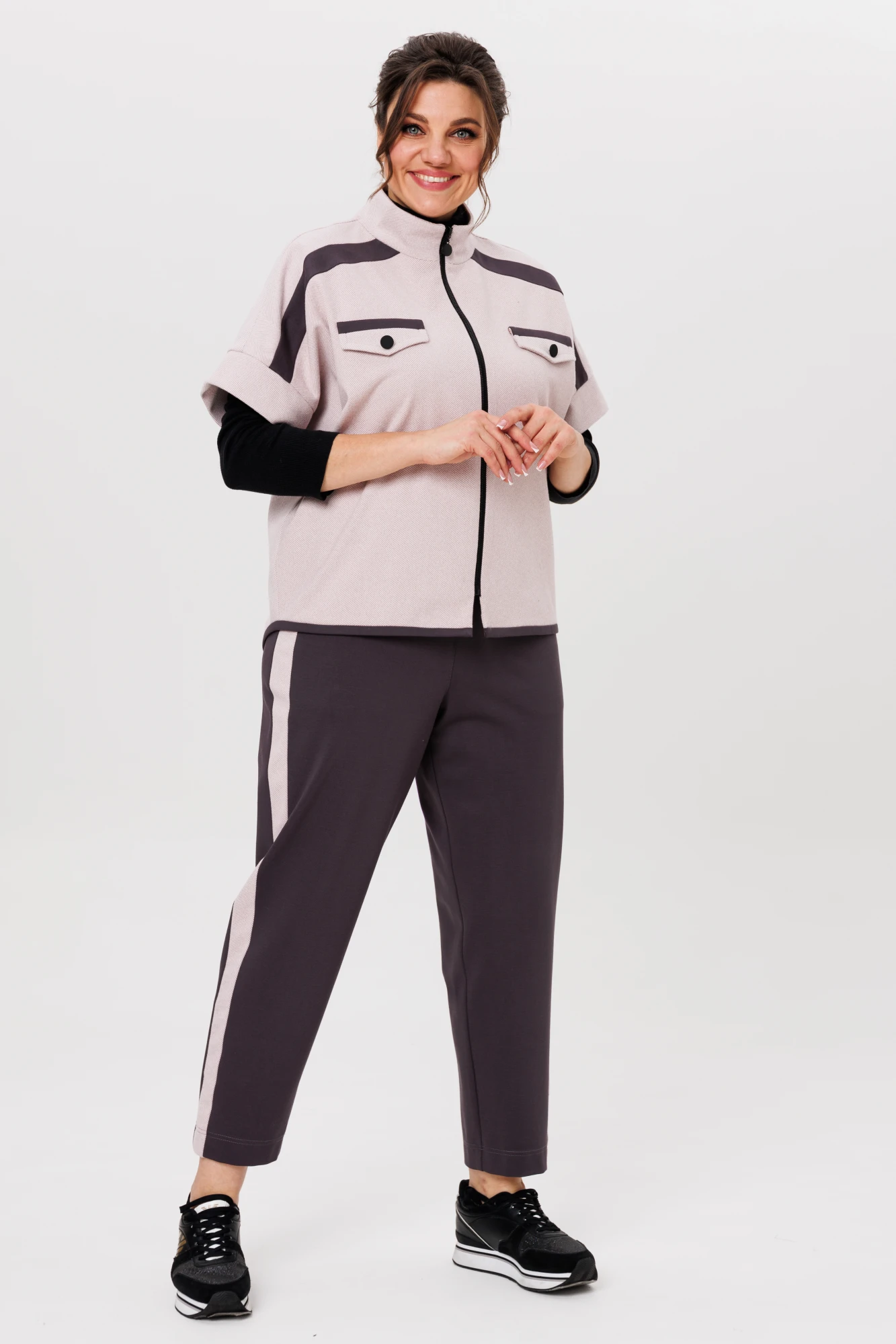 ниверсальный женский брючный комплект из двух предметов станет незаменимым для Вашего гардероба в наступающем сезоне. Комплект женский, брючный, повседневный, скомбинированный из двух материалов-компаньонов. Жилет прямого силуэта, длиной до бедер, со спущенным плечом, воротником-стойкой и центральной застежкой на тесьму-молнию . Перед с плечевыми кокетками, отделочными вставками контрастного цвета и нагрудными клапанами с контрастной отделкой и пуговицами. Спинка с плечевой кокеткой и отделочной вставкой контрастного цвета. Спинка со средним швом. Пройма с притачной широкой манжетой. Низ жилета фигурный с отделочной бейкой. Брюки "бананы", укороченные, по верху - на притачном поясе с резинкой. Передние части брюк с боковыми карманами и лампасами из контрастного материала. Оба предмета данного комплекта отлично сочетаются между собой и смело могут создавать комбинации с другими вещами.