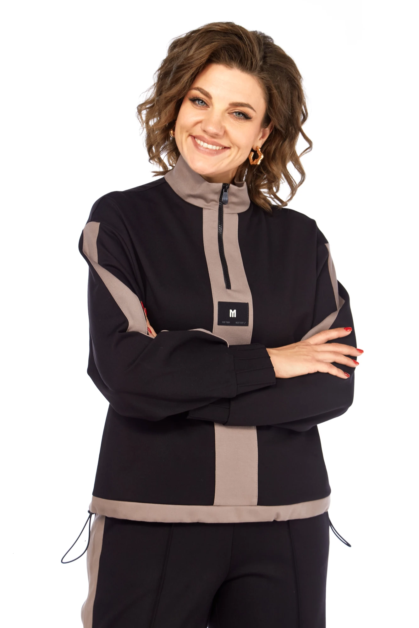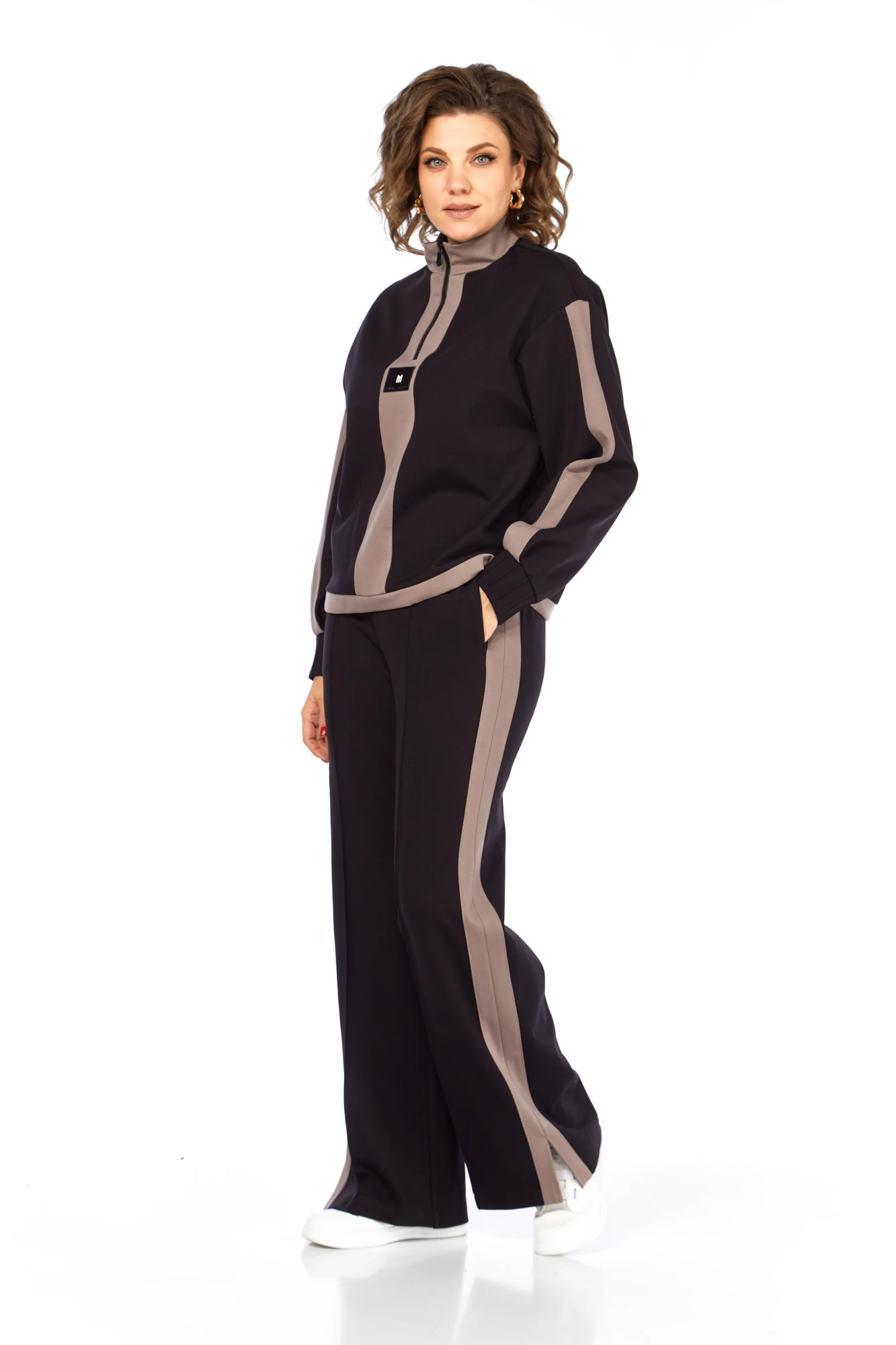 Костюм женский спорт-шик. Джемпер прямого силуэта, со спущенным рукавом. Воротник-стойка из отделочной ткани, планка по центру, в которой вставлена молния, декаротивная нашивка. Рукав с планками из отделочной ткани и декоративные защипы на манжетах. По низу кулиска с фиксаторами. Брюки прямые, по переду застрочены стрелки, по внешней стороне отделочные детали с разрезами по низу. Карманы в боковых швах, пояс на резинке.