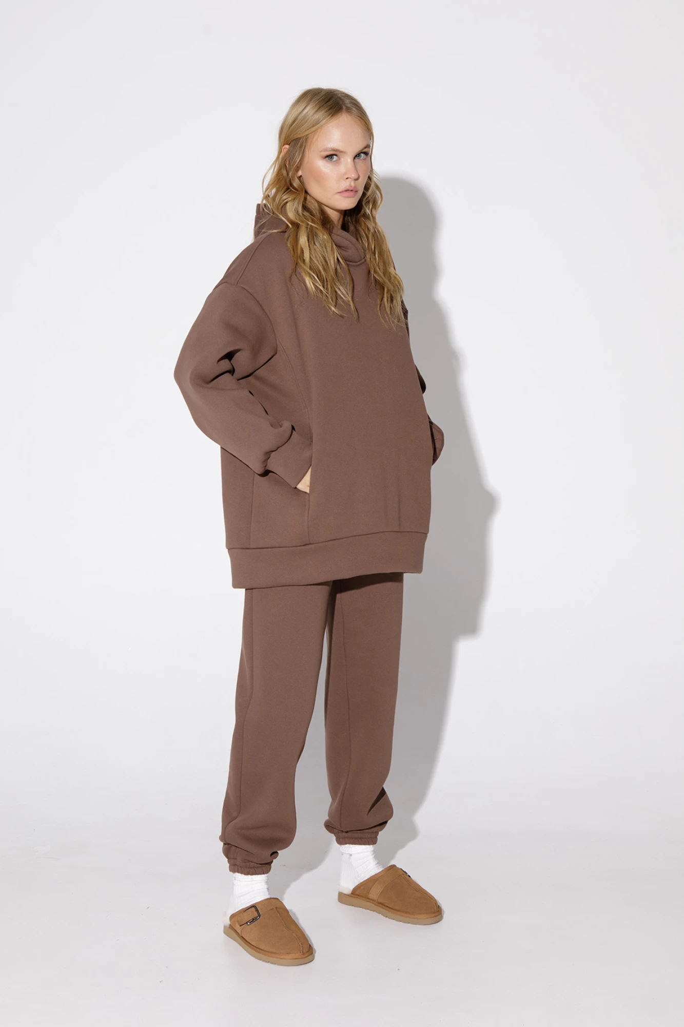 Утепленный трикотажный костюм-двойка из свободного худи и брюк-джоггеров. Детали: худи свободного покроя, спущенная линия плеча, перед с карманами в рельефных швах, капюшон, широкий притачной пояс, рукава длинные с притачными манжетами. Брюки с высокой посадкой на эластичном поясе, карманы в боковых швах, низ брюк на резинке. Длина худи по спинке около 73 см в размерах 40-46 и около 76 см в размерах 48-52, длина рукава+ плечо около 51+12=62 см. Длина брюк с поясом около 103 см в размерах 40-46 и около 104-5 см в размерах 48-52 см.