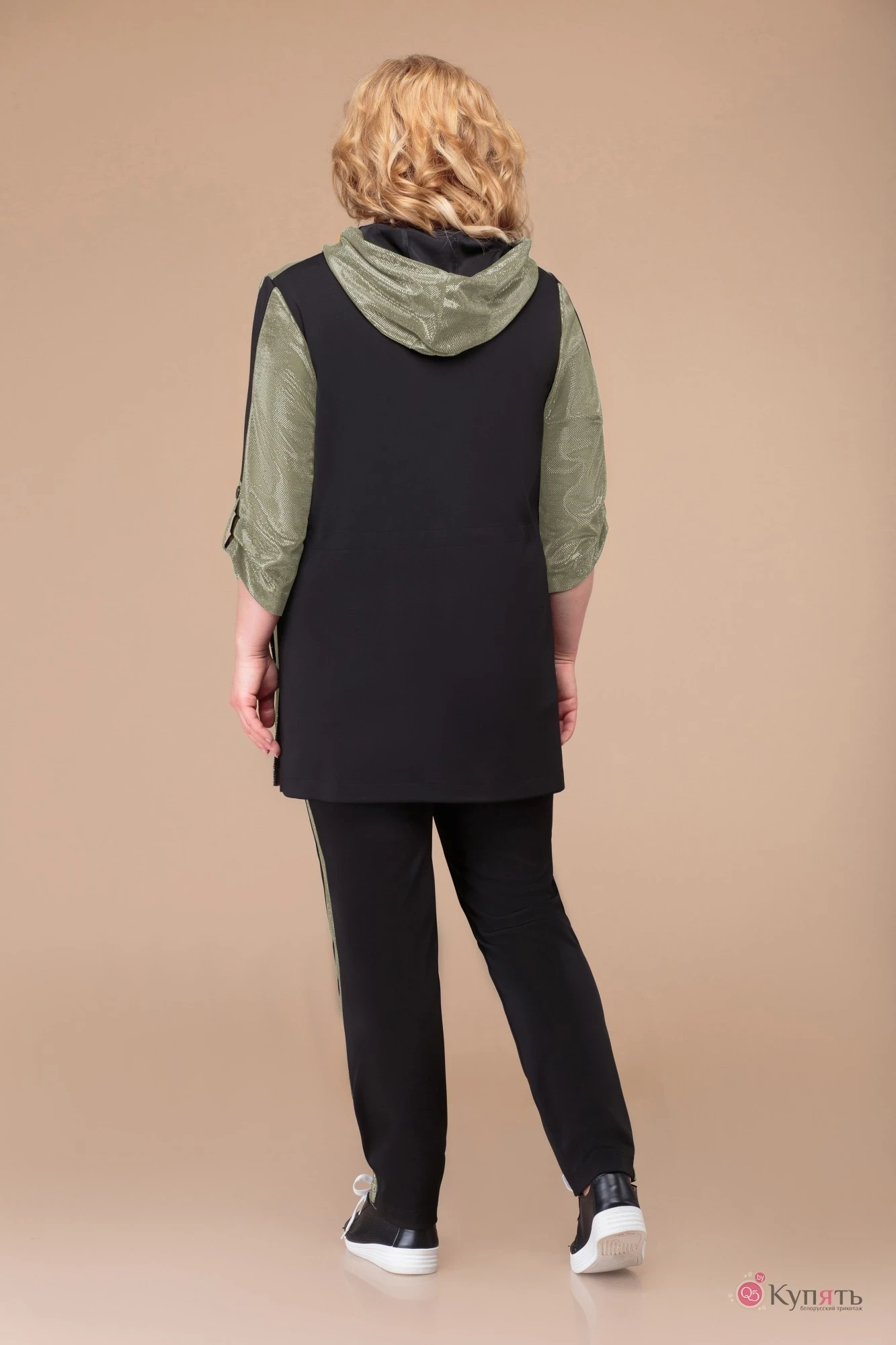 Куртка прямого силуэта, с капюшоном, по краю капюшона прострочена кулиса, в люверсы которой протянут декоративный шнур. Перед изделия с нагрудными вытачками. По талии куртки кулиса, в люверсы которой протянут декоративный шнур. В боковых швах разрезы. Спереди прорезные функциональные карманы. Рукав втачной с декоративной патой из отделочной ткани. По рукаву лампас из основной ткани. Застежка в куртке спереди на молнию. Изделие без подкладки и плечевых накладок. Ткань тянется. Перед куртки, капюшон и рукава из отделочной ткани.