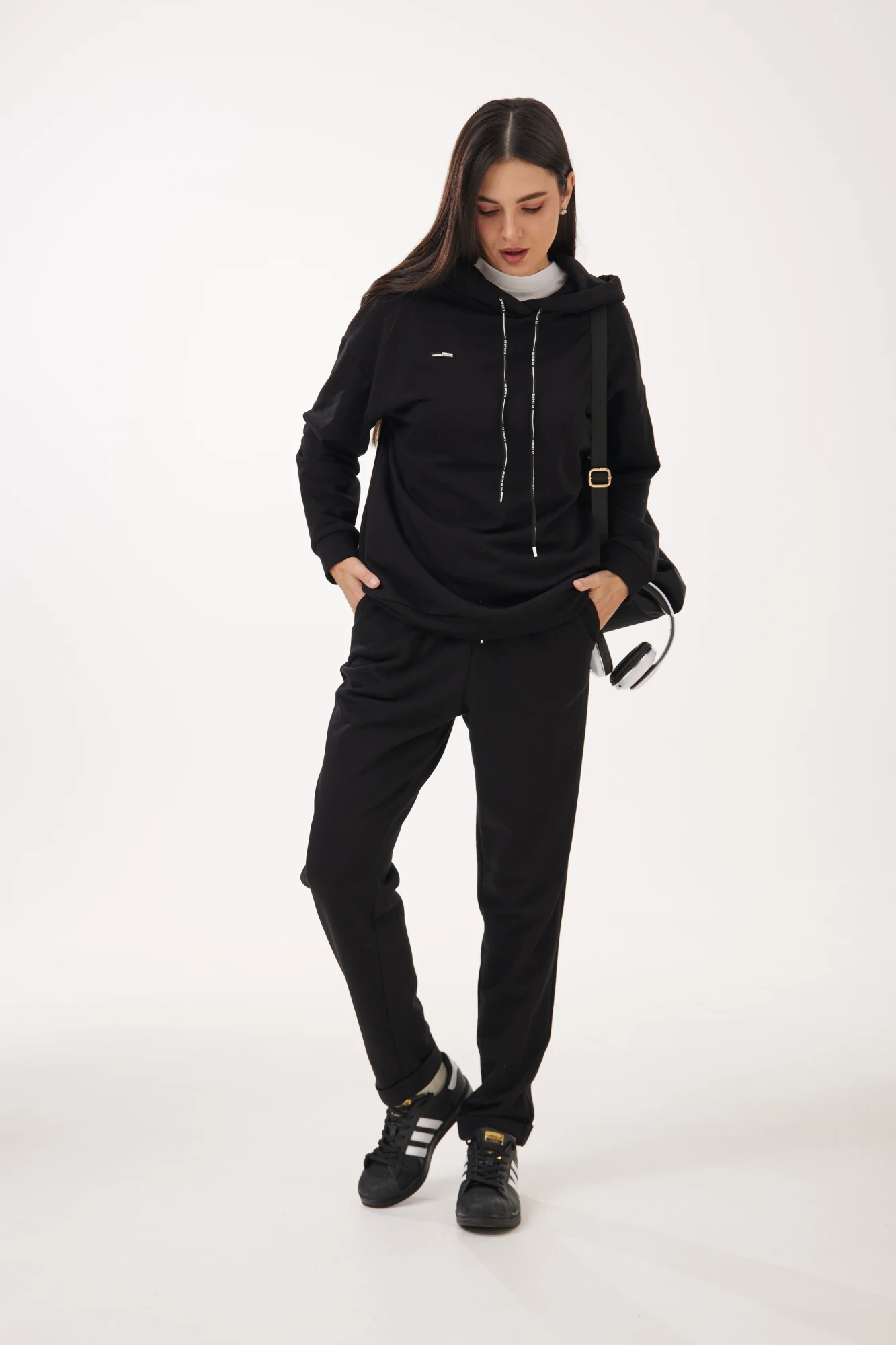 Костюм двойка включает в себя брюки с цельнокроенной манжетой и удлиненного худи с капюшоном.