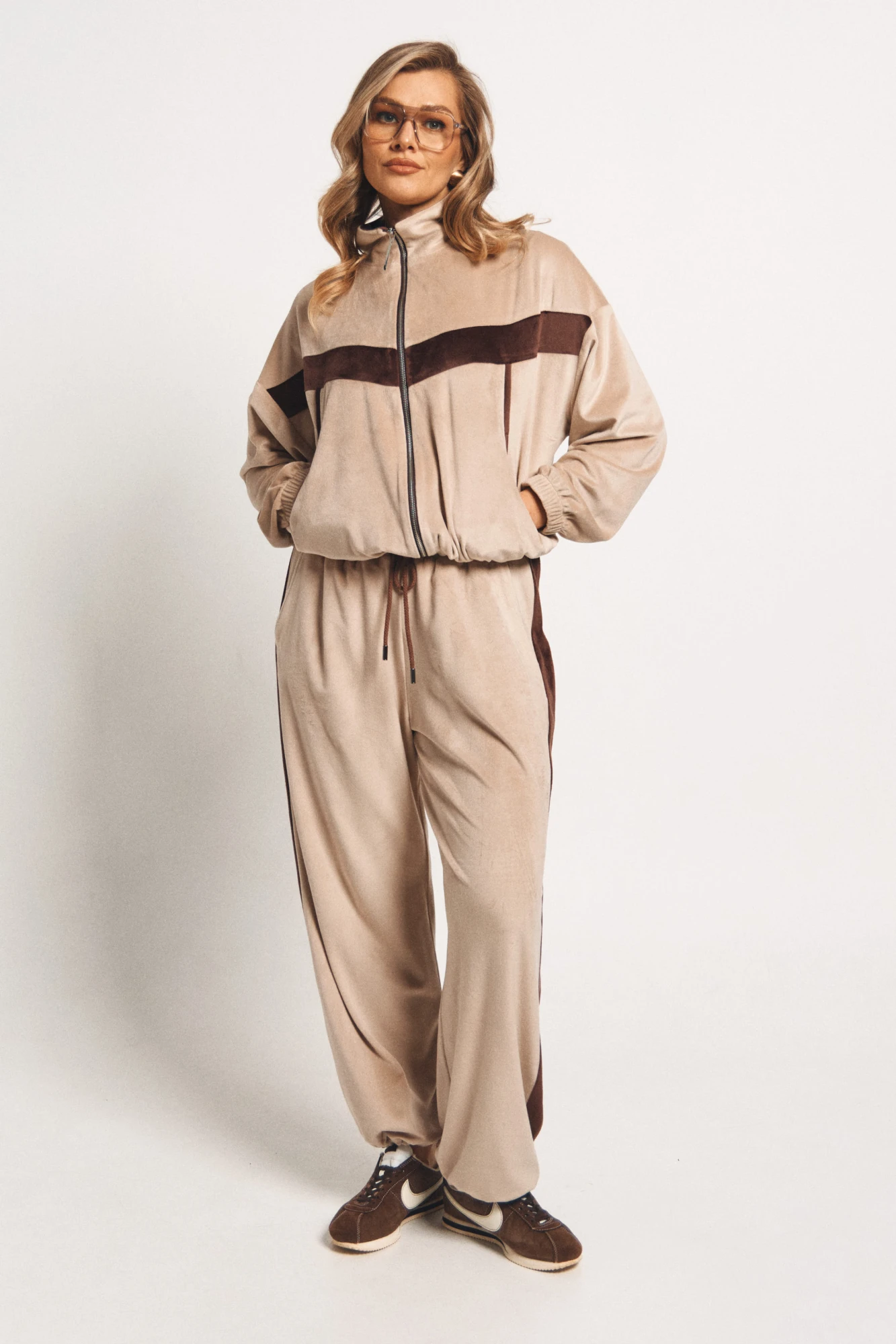 Костюм спортивный женский состоит из джемпера и брюк. Костюм выполнен из велюровой ткани.