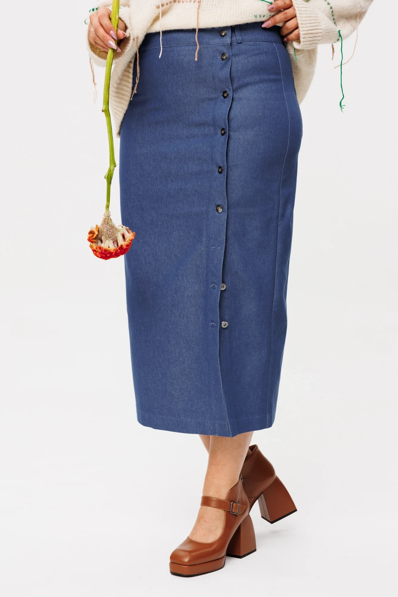 Джинсовые болты спереди позволяют регулировать длину выреза, добавляя образу уникальность и удобство. Два кармана сзади не только придают юбке стильный вид, но и обеспечивают функциональность.