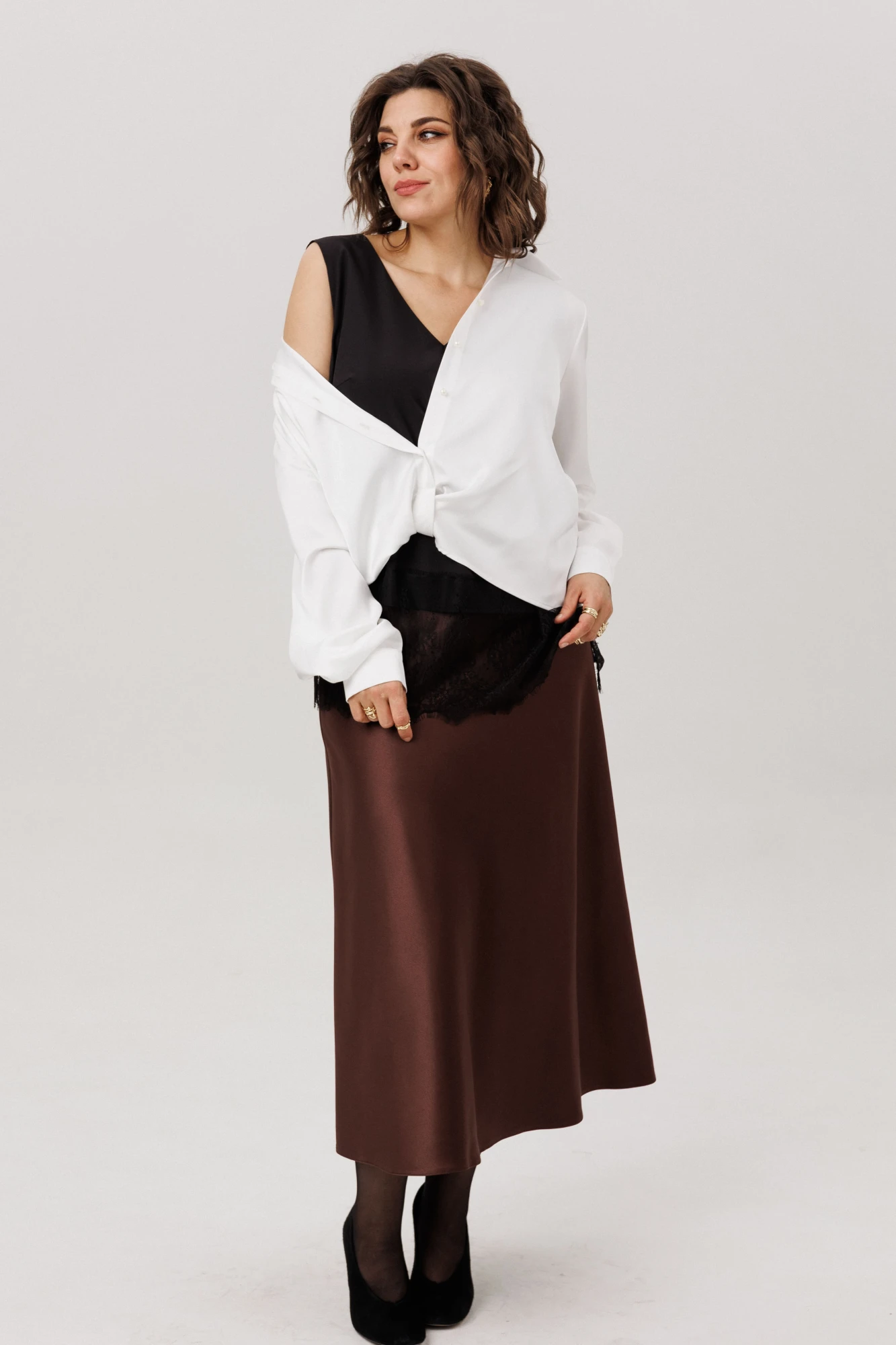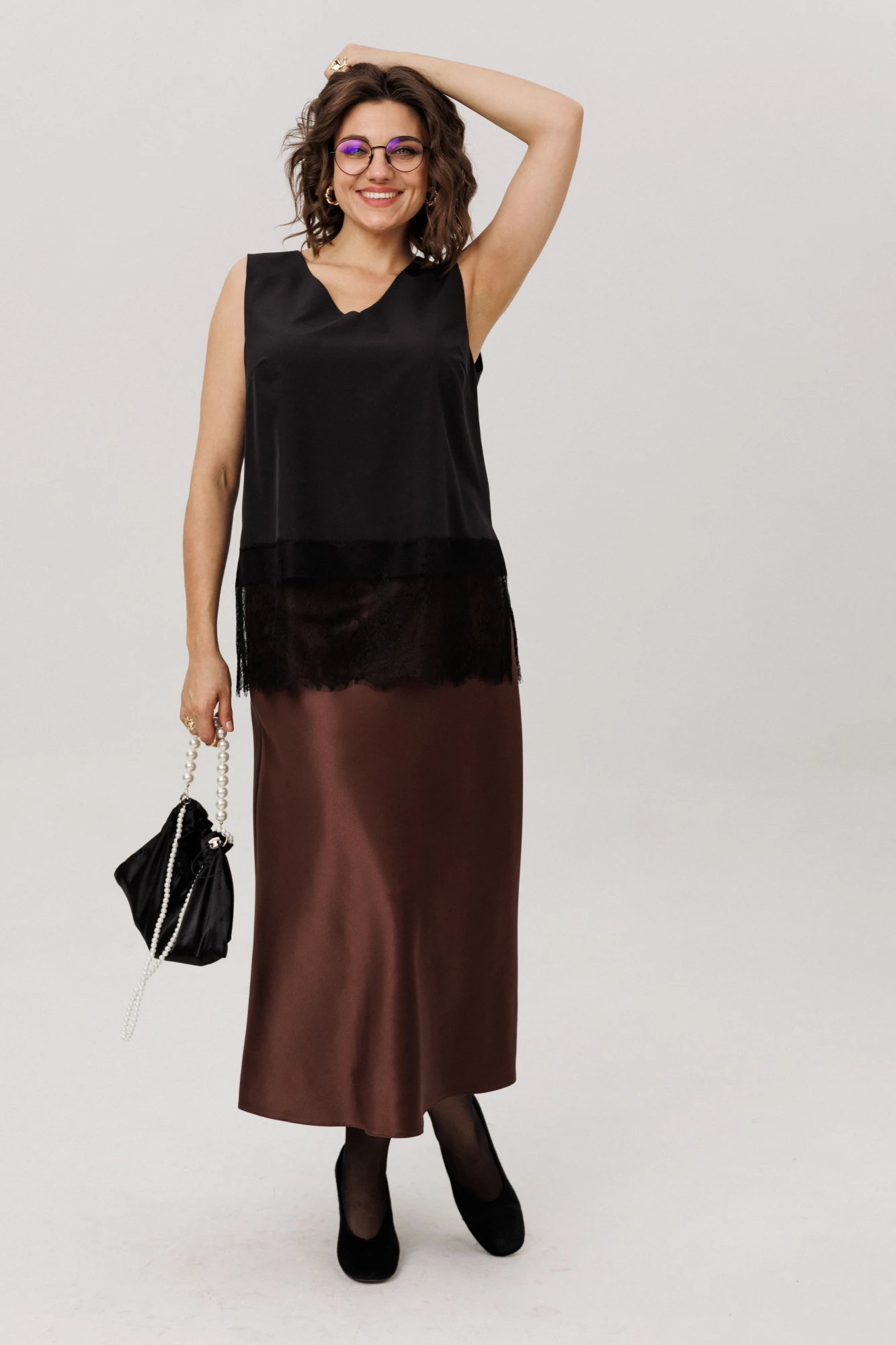 На модели в юбке цвета «горький шоколад» кружевной топ 1664 и блуза 1663.