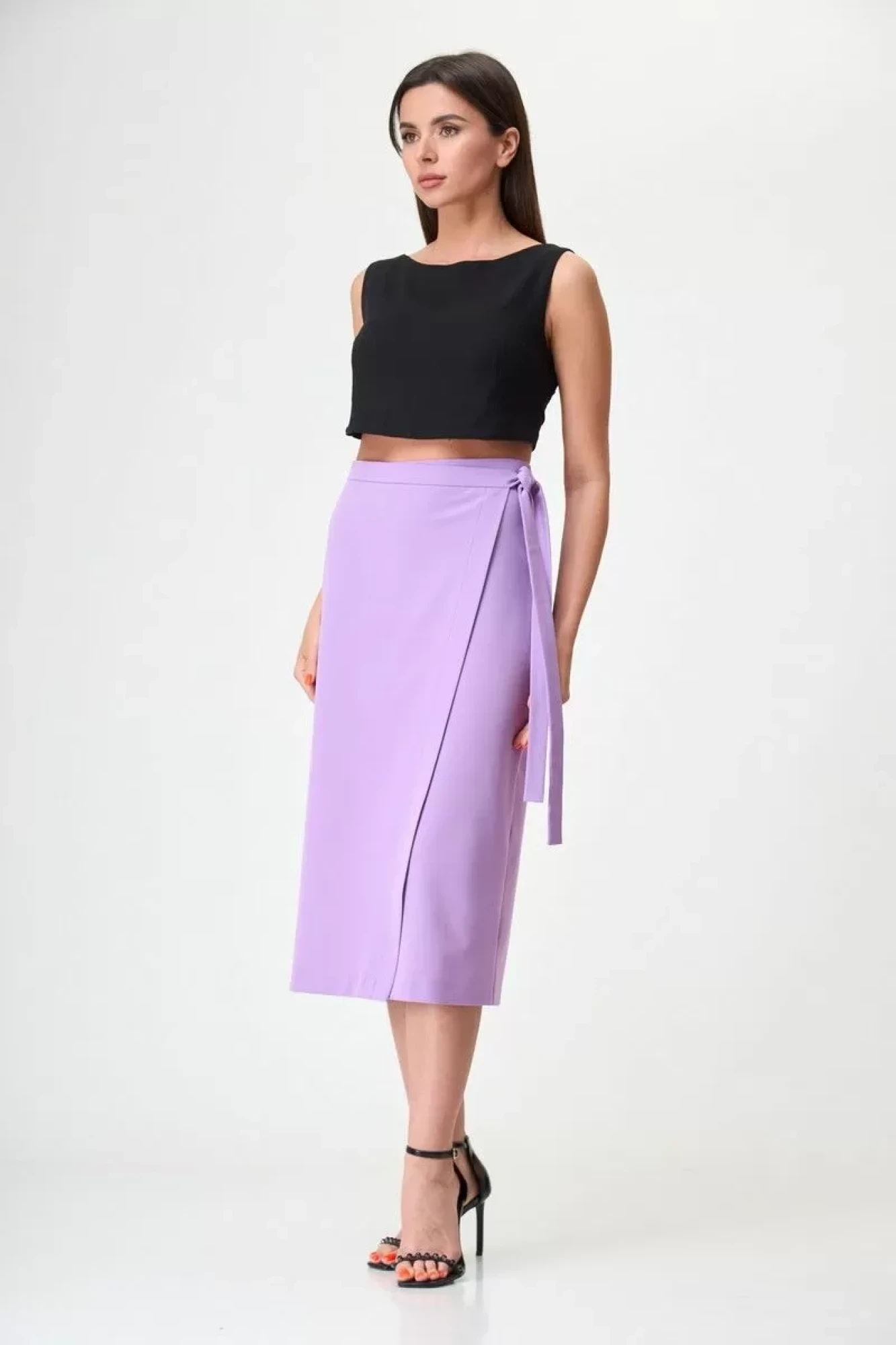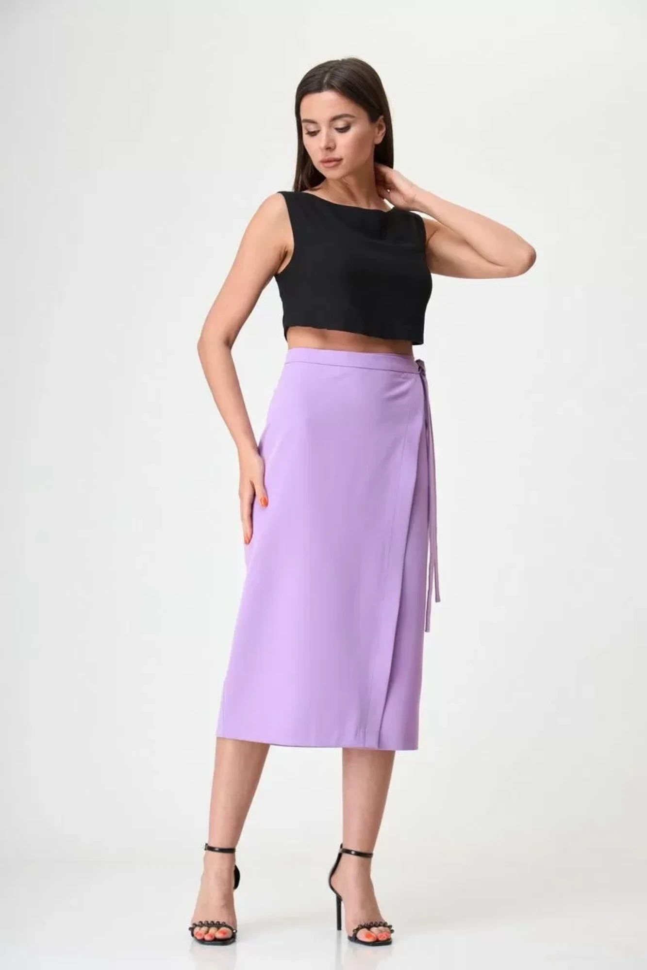 Юбка с элементом запаха, на притачном поясе. Выполнена из костюмной ткани в чёрном цвете, без подкладки. В новейших моделях запах располагается спереди сбоку. Это формирует изящный вырез треугольной формы, который смотрится очень женственно.