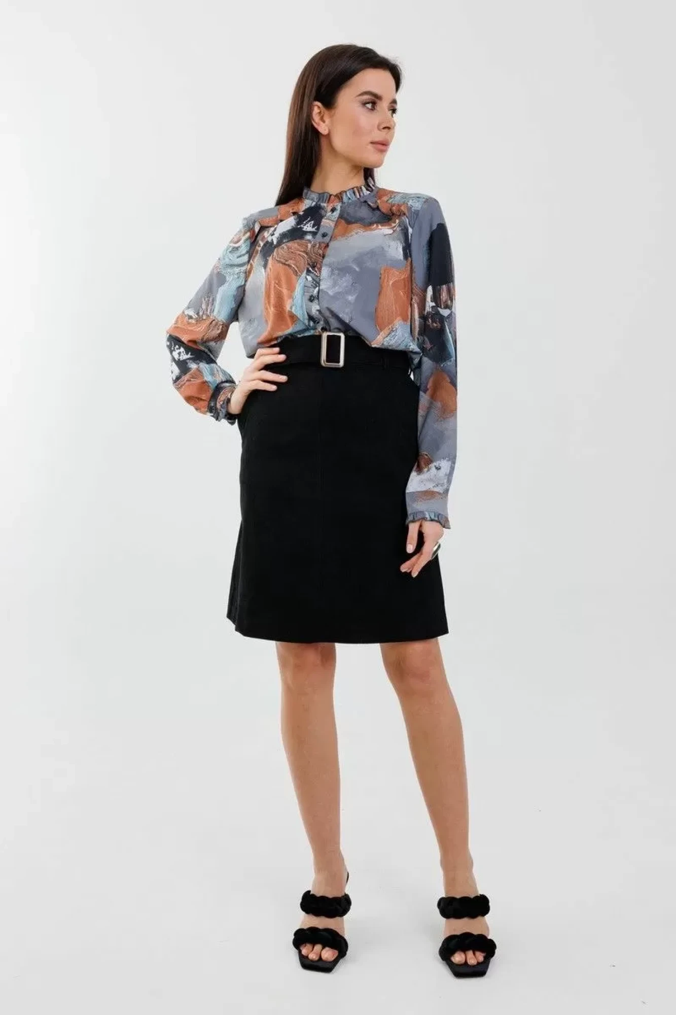 Юбка женская, силуэт трапеция, длина до колена. Высокая посадка, подчеркивающая вашу талию и визуально удлиняющая ноги. Дополнительно можно подчеркнуть талию при помощи съемного пояса. По спинке декоративные клапаны на бедрах, в среднем шве потайная застежка-молния. Функциональные карманы в боковых швах. Есть подкладка из полиэстера.