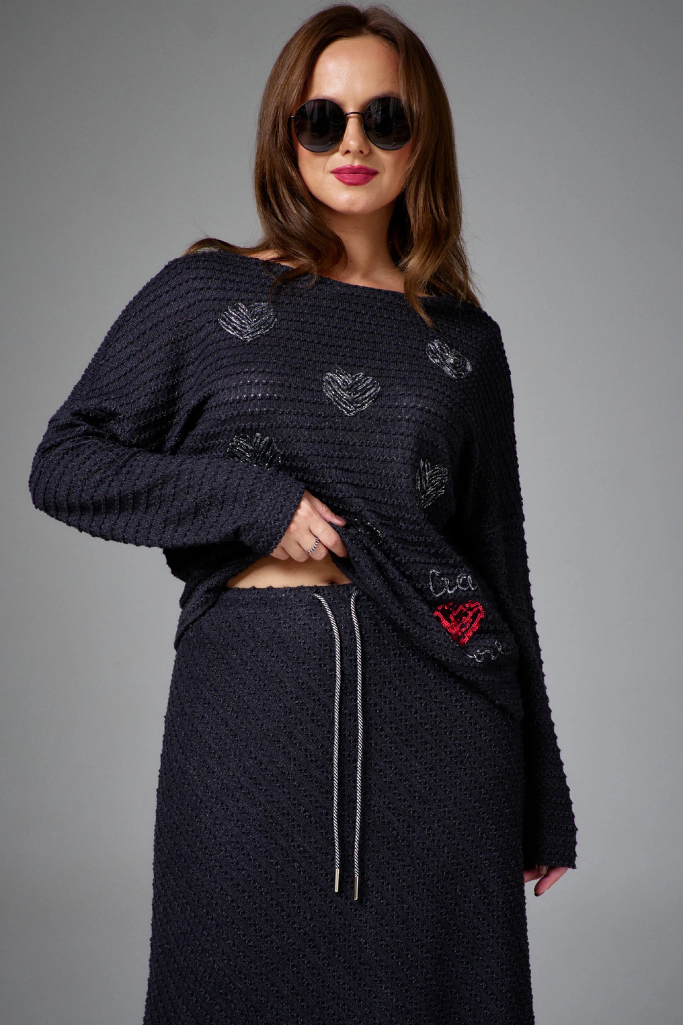 Юбка из ажурного трикотажа, расширенного силуэта, скроеная по косой, длиной миди. Пояс на резинке, с кулисой и серебристым шнуром. Изделие на трикотажной подкладке.
