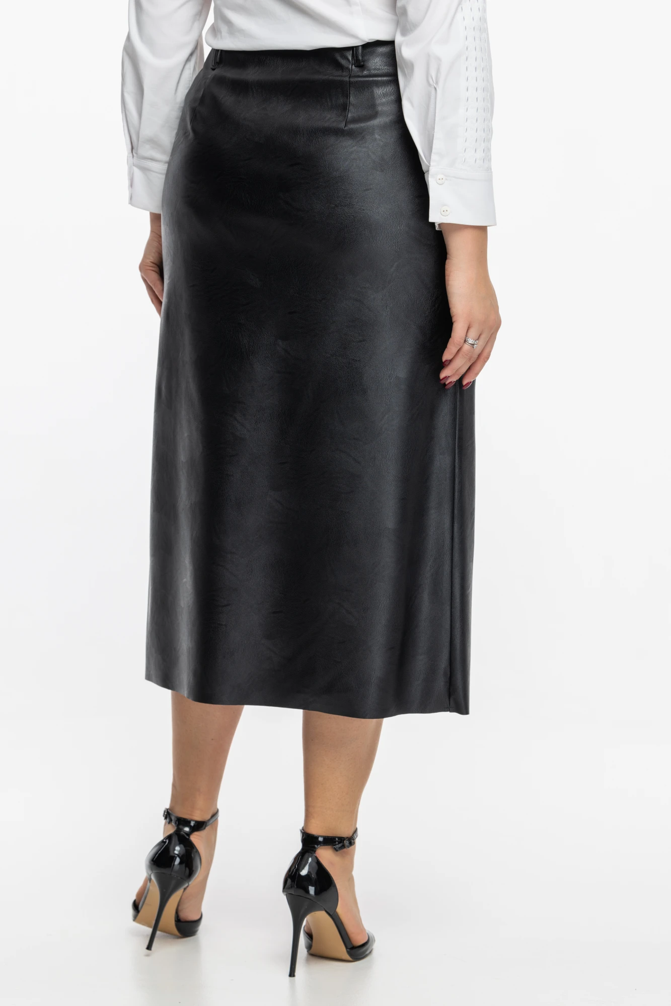 НУльтрамодная юбка, выполненная из искуственной кожи. Юбка на подкладке, в качестве застежки молния. Юбка очень комфортная, стильная, прекрасно сочетается с джемперами, кофточками и блузками и жакетами. Юбка на фигуре смотрится элегантно и одновременно строго. Подойдет как для повседневного образа, так и для выхода в театр, кафе