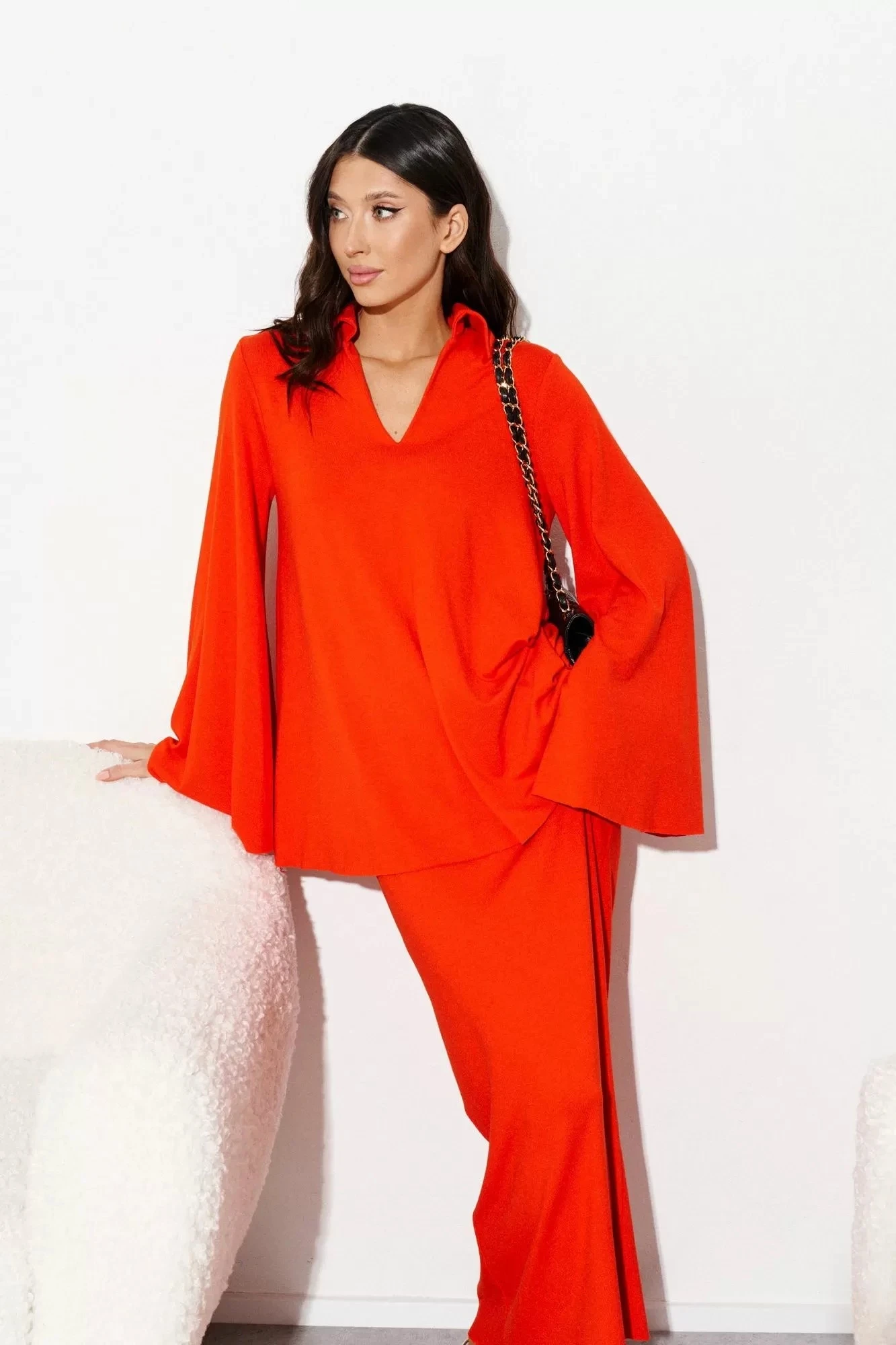 Юбка прилегающего силуэта выполнена из трикотажного полотна оранжевого цвета. Характеристики: прилегающий силуэт, пояс цельнокроеный на резинке. Длина 111 см