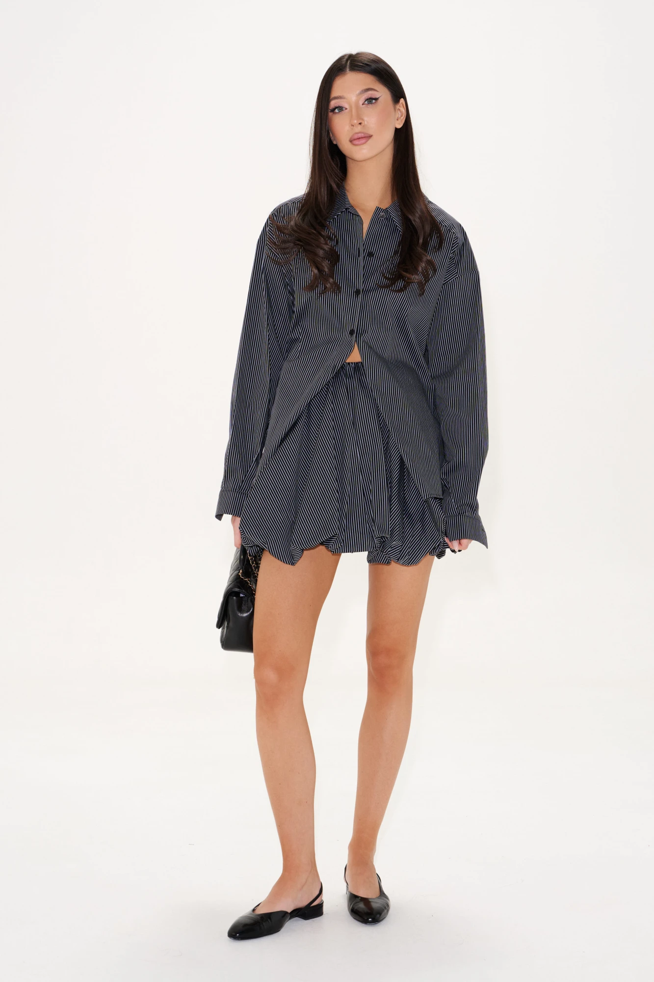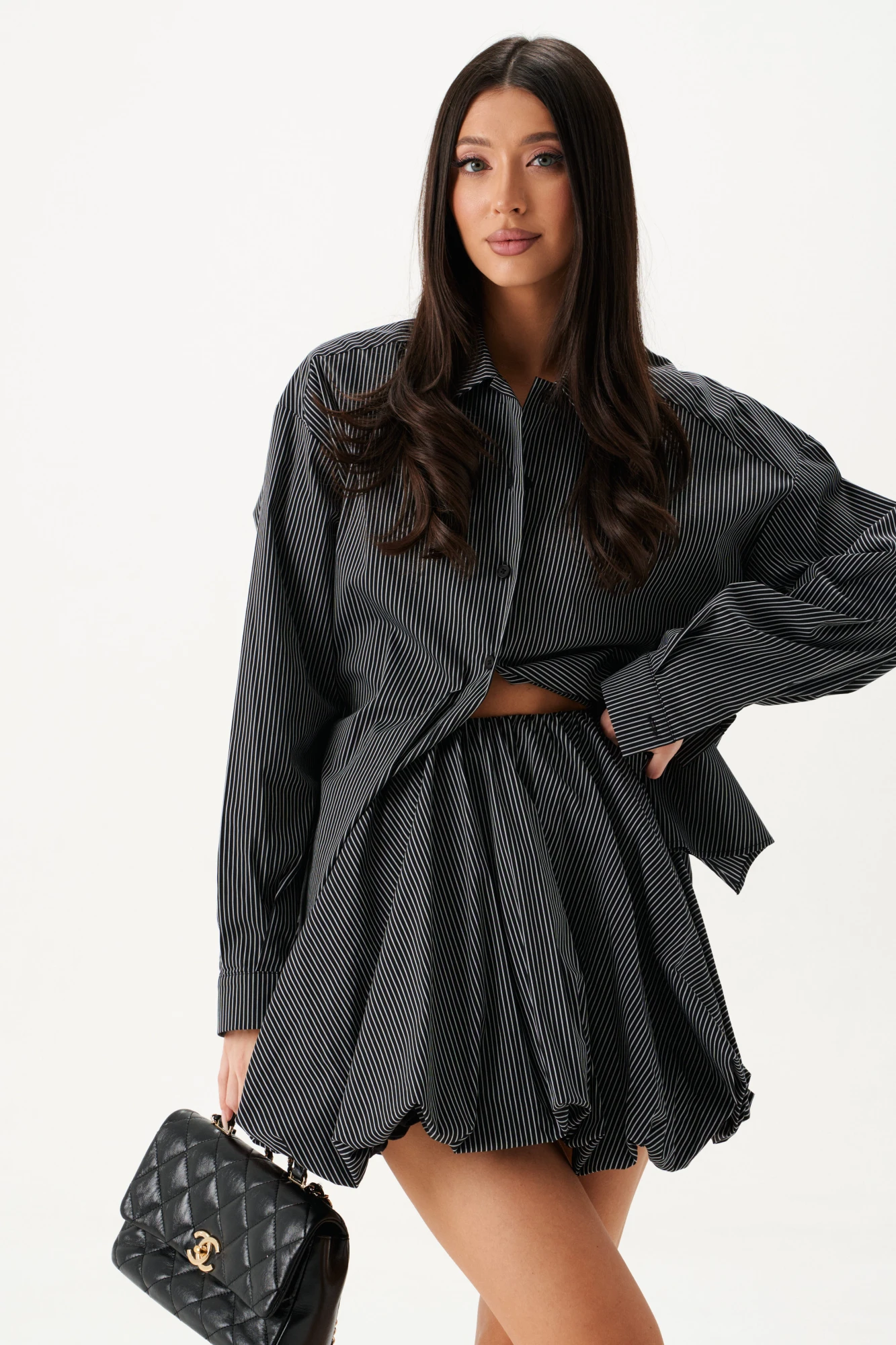 Юбка-баллон в длине мини. Выполнена из хлопкового полотна черного цвета в полоску. Пояс на резинке. Есть подкладка. Застёжки нет. Длина 41 см
