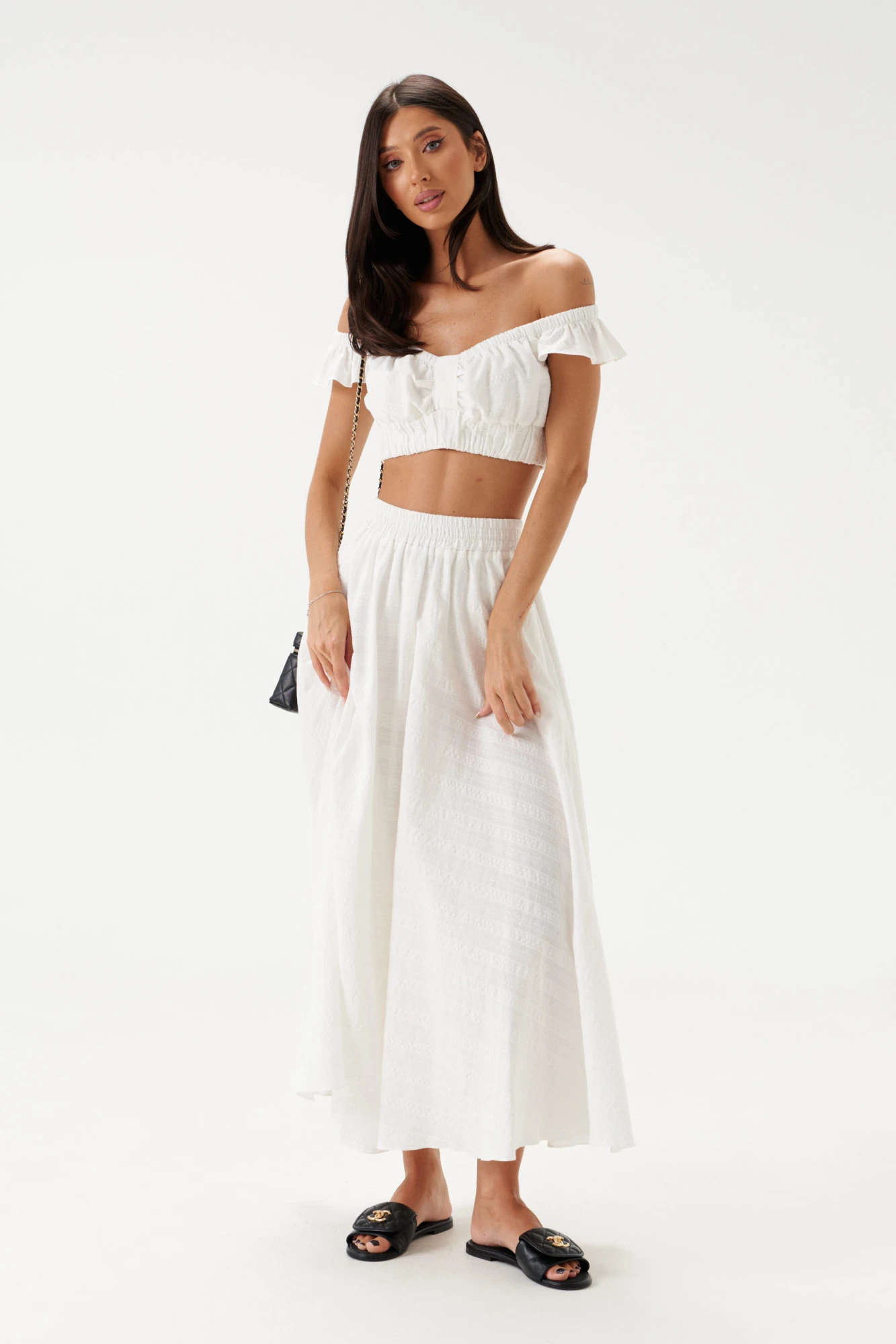 Юбка кроя полусолнце, выполнена из ажурного полотна тепло-белого цвета.Характеристики: крой полусолнце, подкладка мини шортиками, по бокам изделия шов с каманами, пояс на резинке со сборкой. Длина юбки 93 см.