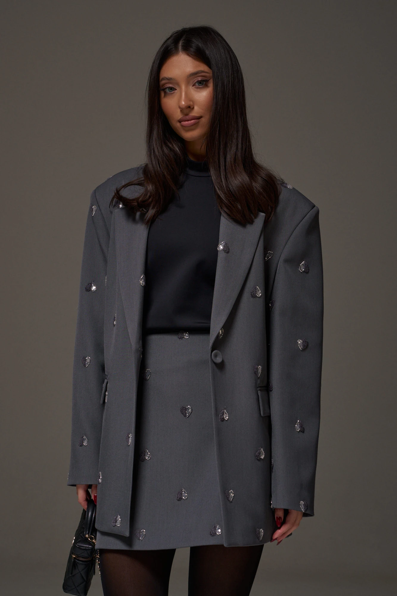 Юбка-мини прямого кроя. Выполнена из костюмной ткани серого цвета, декорированной сердечками. Силуэт - трапеция, брендированная подкладка. Застежка - потайная молния в шве заднего полотна изделия. Длина 42см.