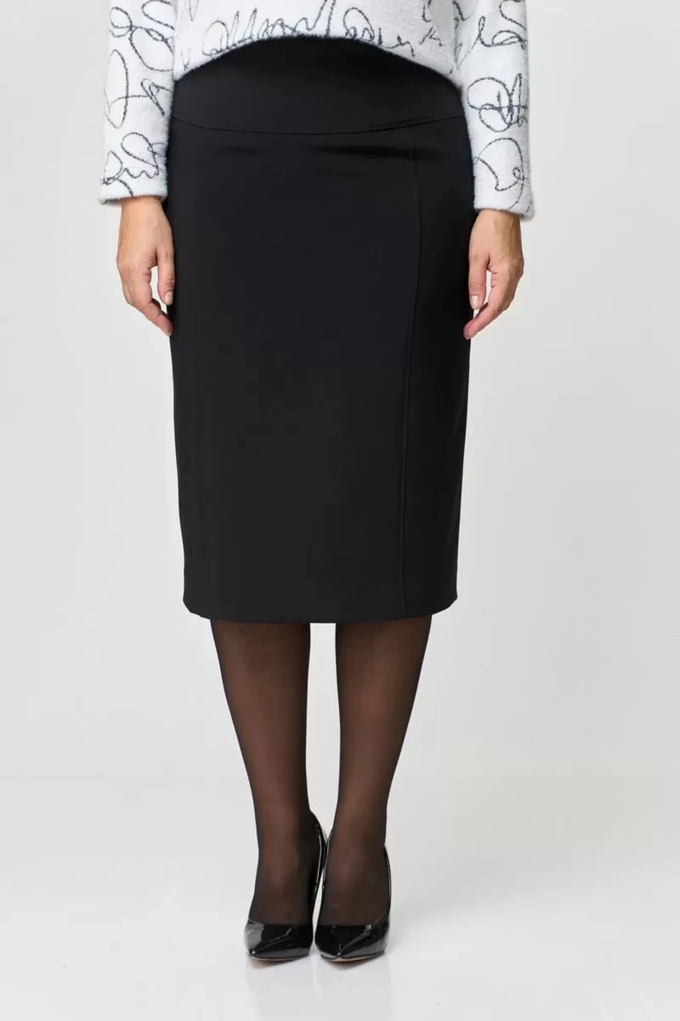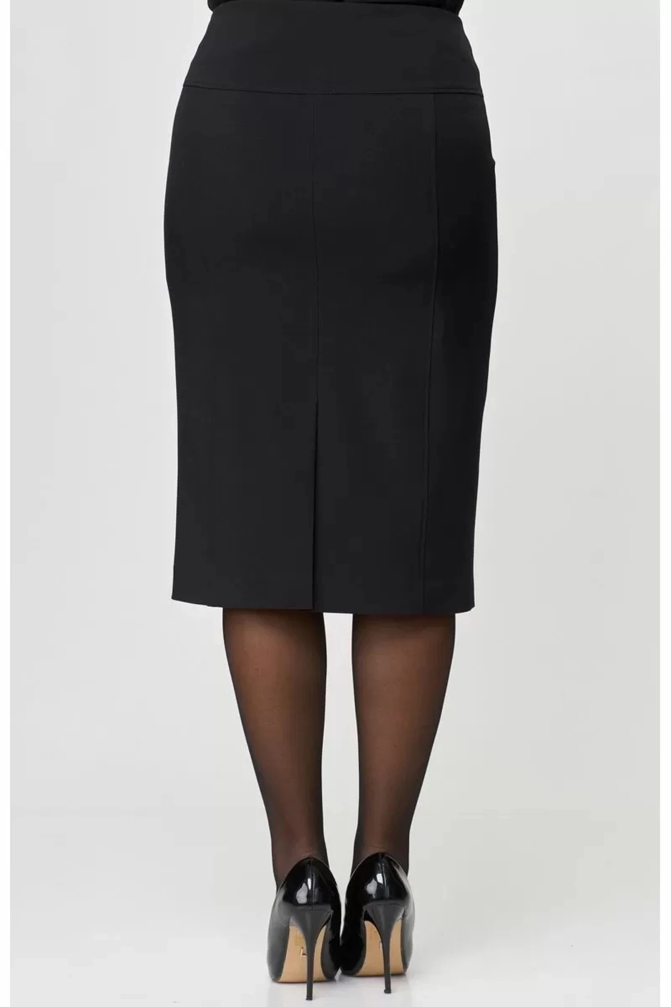Юбка прямого силуэта, из текстильной ткани, верхний срез юбки обработан обтачкой, заднее полотнище со средним швом, застегивается на потайную молнию. Шов переходит к низу в шлицу. Юбка по преднему и заднему полотнищу с кокеткой и вертикальными рельефами, швы отстрочены в цвет юбки. Юбка на подкладке.