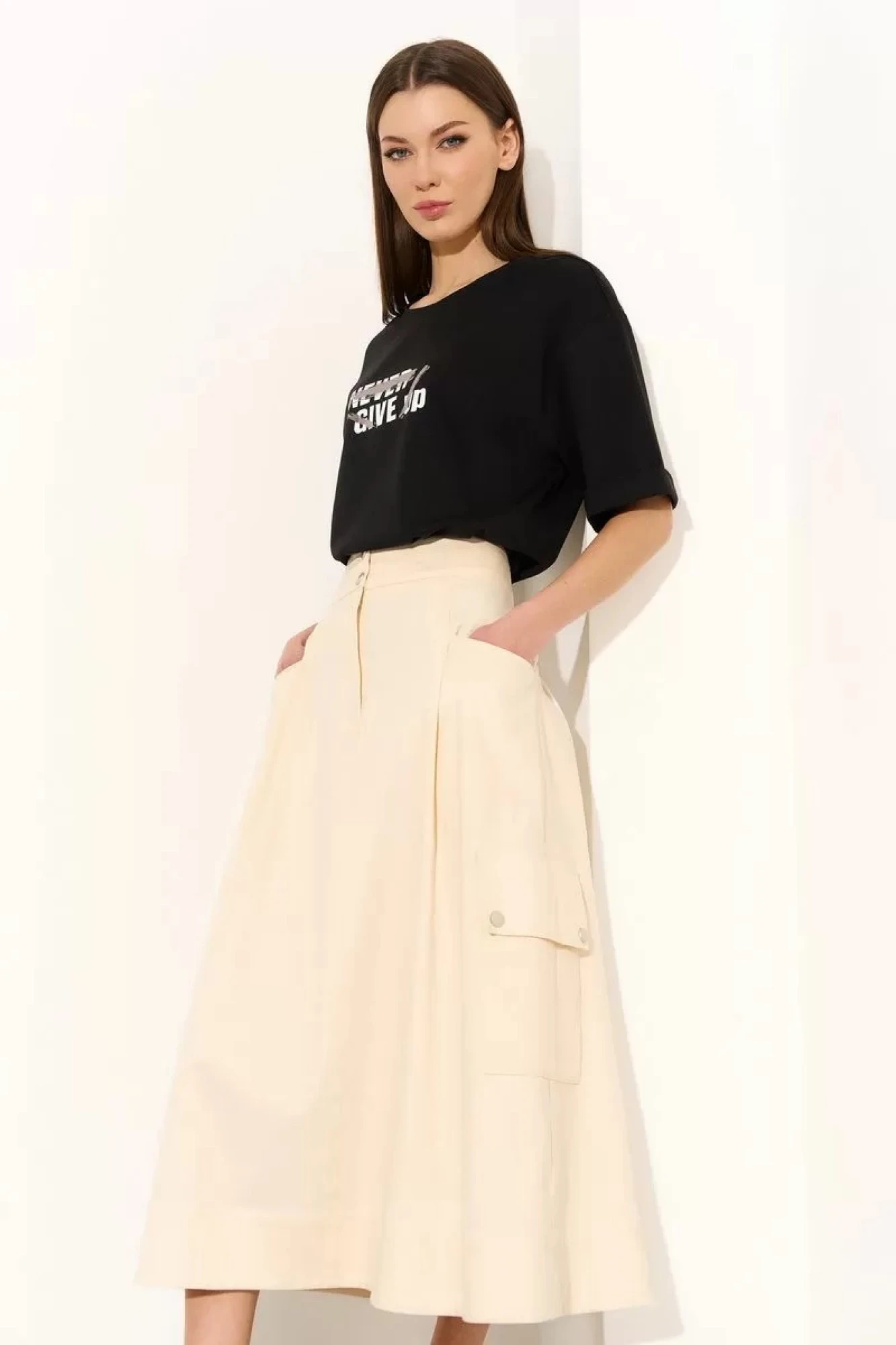 Юбка женская расклешеная из тонкой джинсовой ткани. Пояс притачной с застежкой на пробивные кнопки. В юбке застежка на брючную молнию выполнена в среднем шве переда. В складку на переде входит верхний карман.На боковых швах накладные карманы с клапаном, застегивающимся на пробивные кнопки. Низ юбки обработан широкой обтачкой швом вподгибку с закрытым срезом.