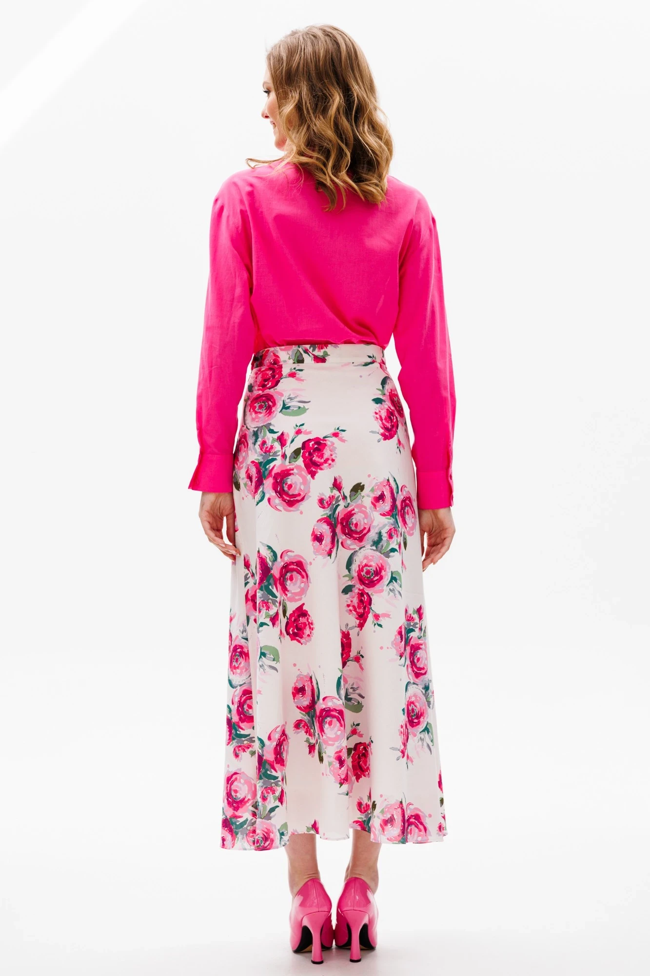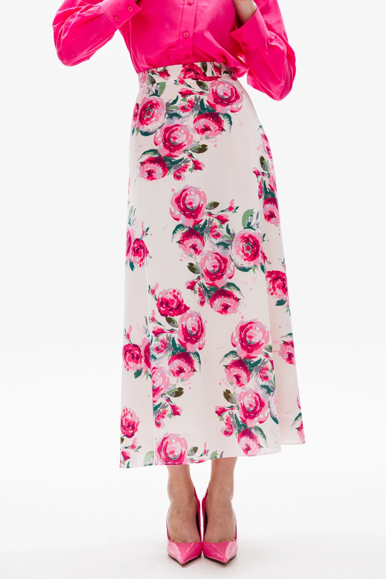 Юбка выполнена из хлопковой ткани с цветочным принтом. Юбка расширенная к низу, на притачном поясе, длиной миди. Переднее и заднее полотнища цельные и выкроены по косой. Застежка в левом боковом шве на потайную молнию и пуговицу. Юбка на отлетной по низу подкладке.
