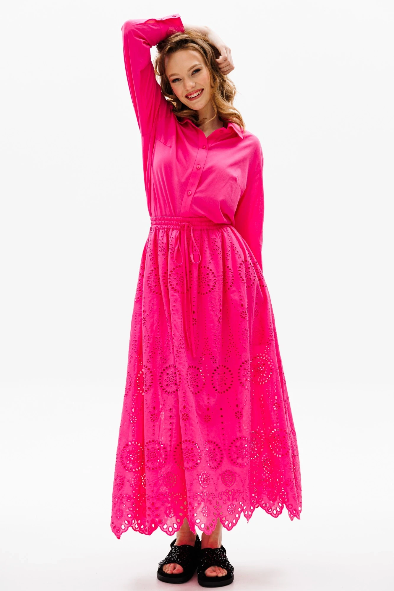 Юбка выполнена из хлопка с вышивкой. Юбка А-образного силуэта, длиной миди на притачном поясе. Переднее и заднее полотнище цельные, расширенные к низу. В боковых швах обработаны карманы. По центру пояса петли, в пояс втянут в шнур. По низу фестоны. Юбка на отлетной по низу подкладке.