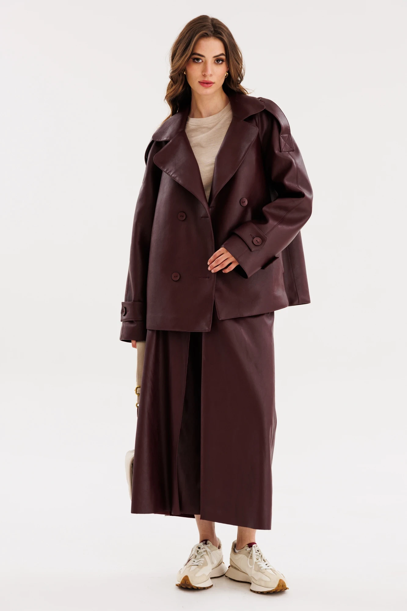 Юбка выполнена из экокожи. Юбка А-образного силуэта, длиной миди, на притачном поясе. Спереди боковые карманы и встречная складка по центру. Застежка в среднем шве спинки на потайную молнию.