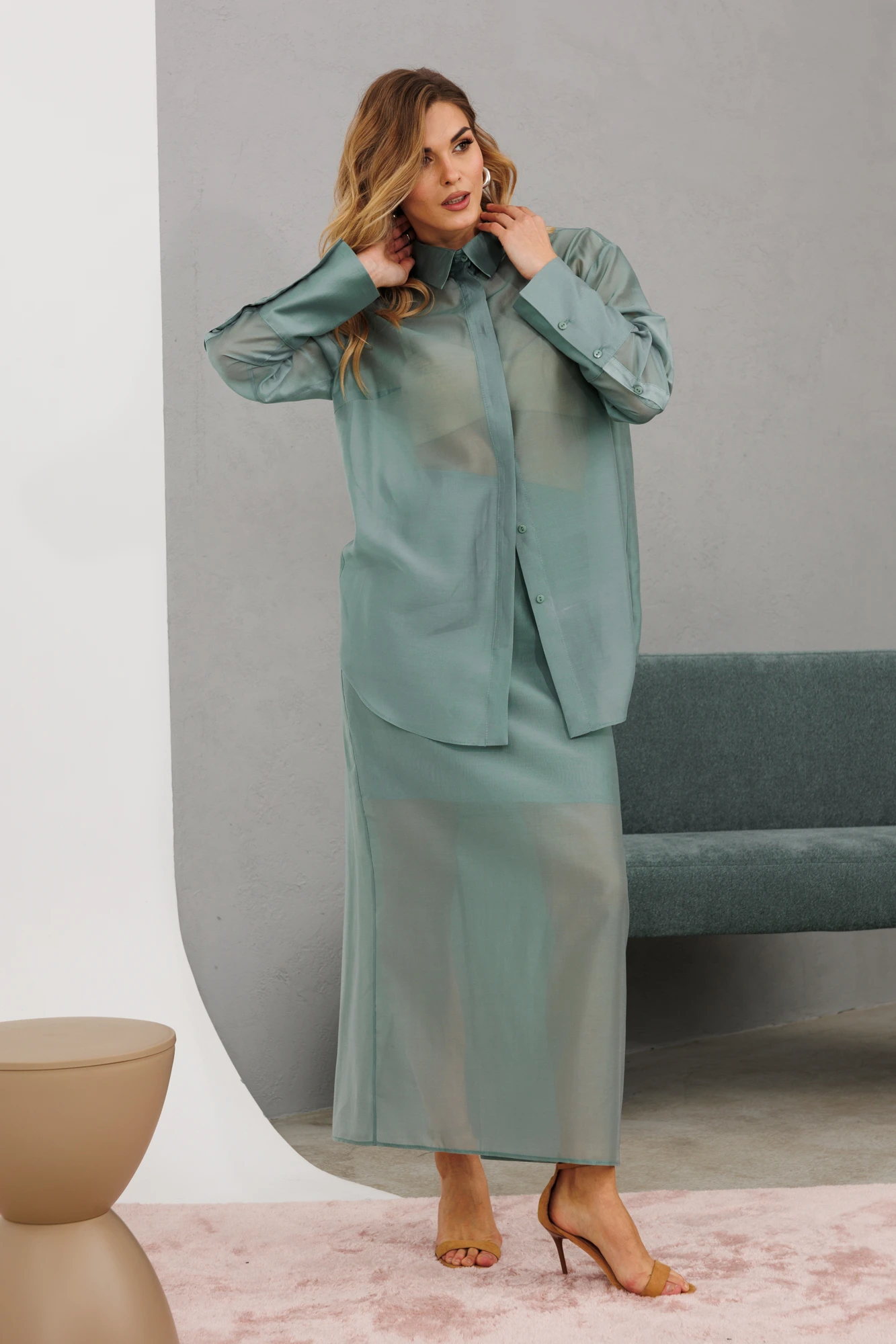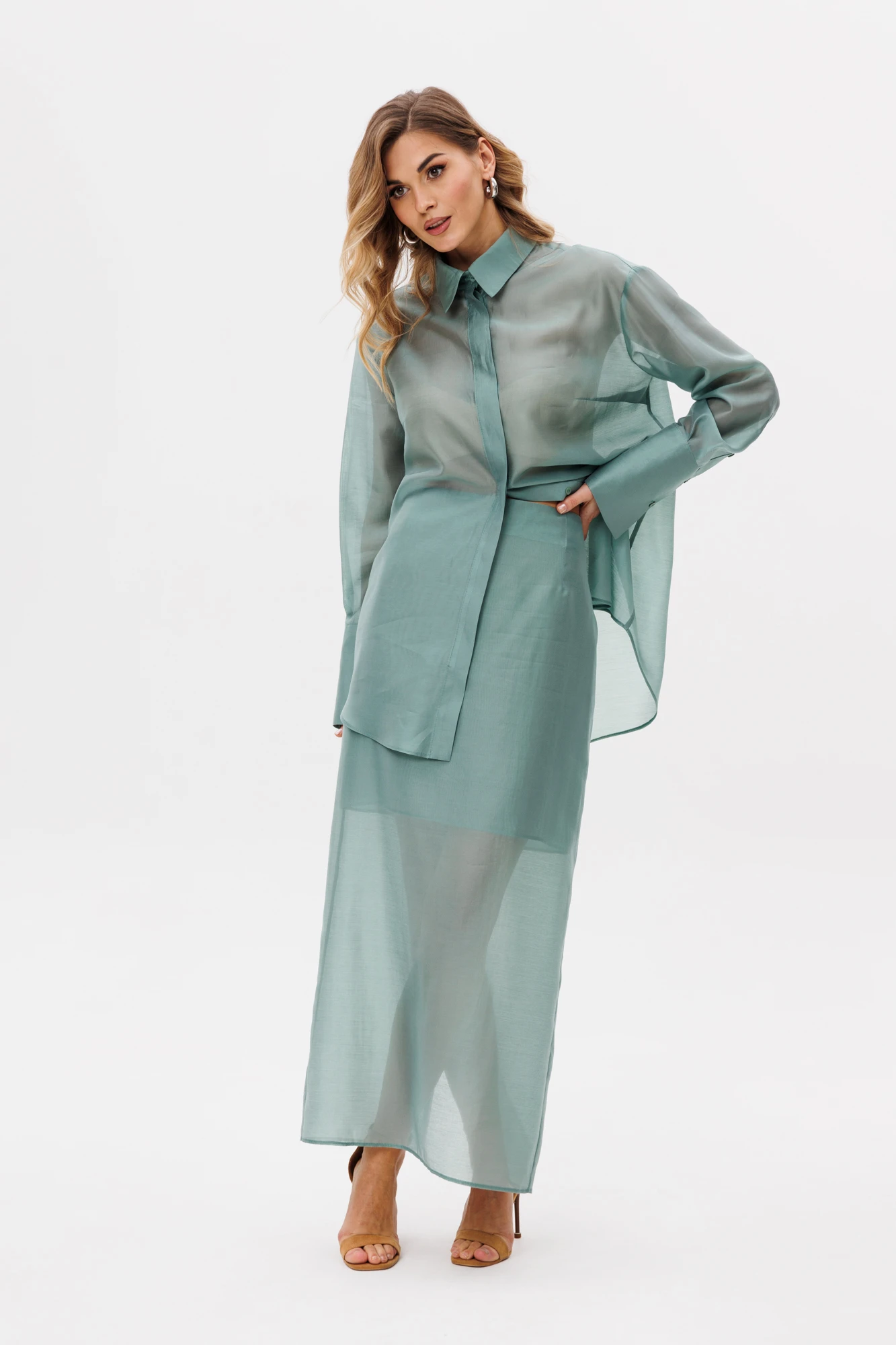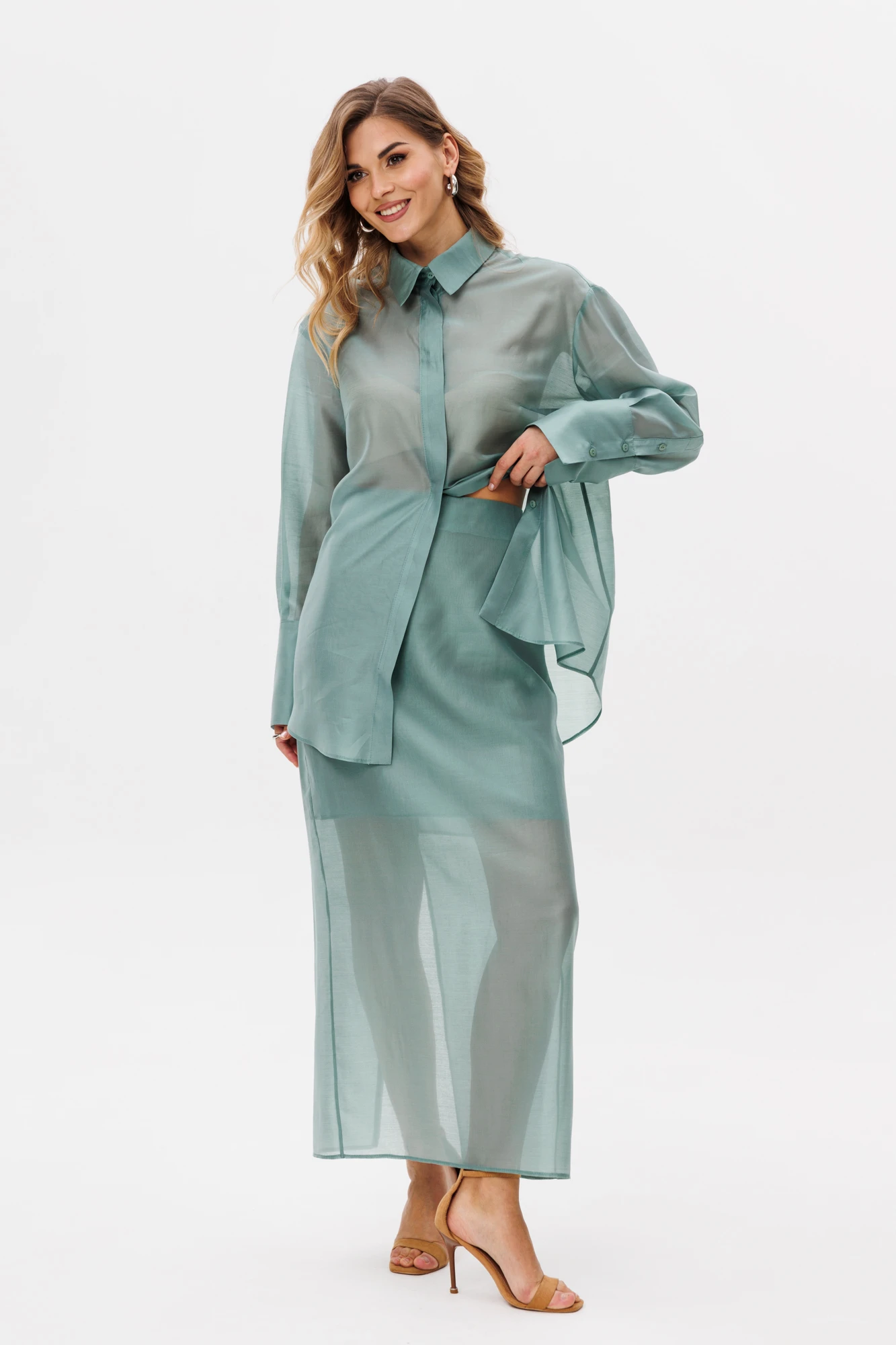 Юбка выполнена из плательно-блузочной ткани. Юбка прямого силуэта длиной миди. Перед цельный. Сзади в среднем шве разрез с застежкой на потайную молнию. Юбка на отлетной по низу подкладке из основной ткани.