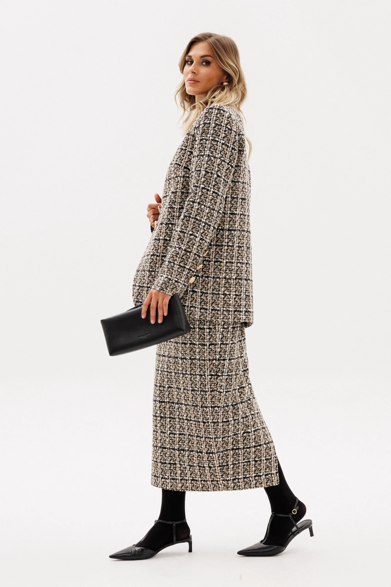 Юбка выполнена из твида. Юбка заужена к низу, длиной миди. Юбка на притачном поясе. Сзади в среднем шве разрез и застежка на потайную молнию и пуговицу. Юбка на отлетной по низу подкладке.