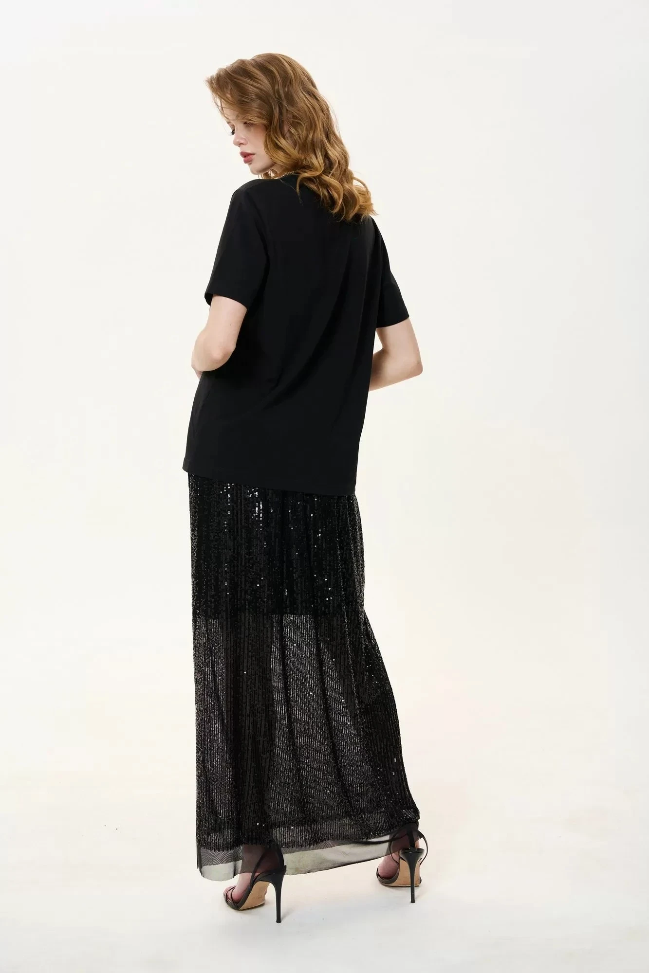 Юбка прямого силута в длине макси. Характеристики: выполнена из паеточной ткани в цвете серебро, пояс обработан эластичной тесьмой (резинкой).