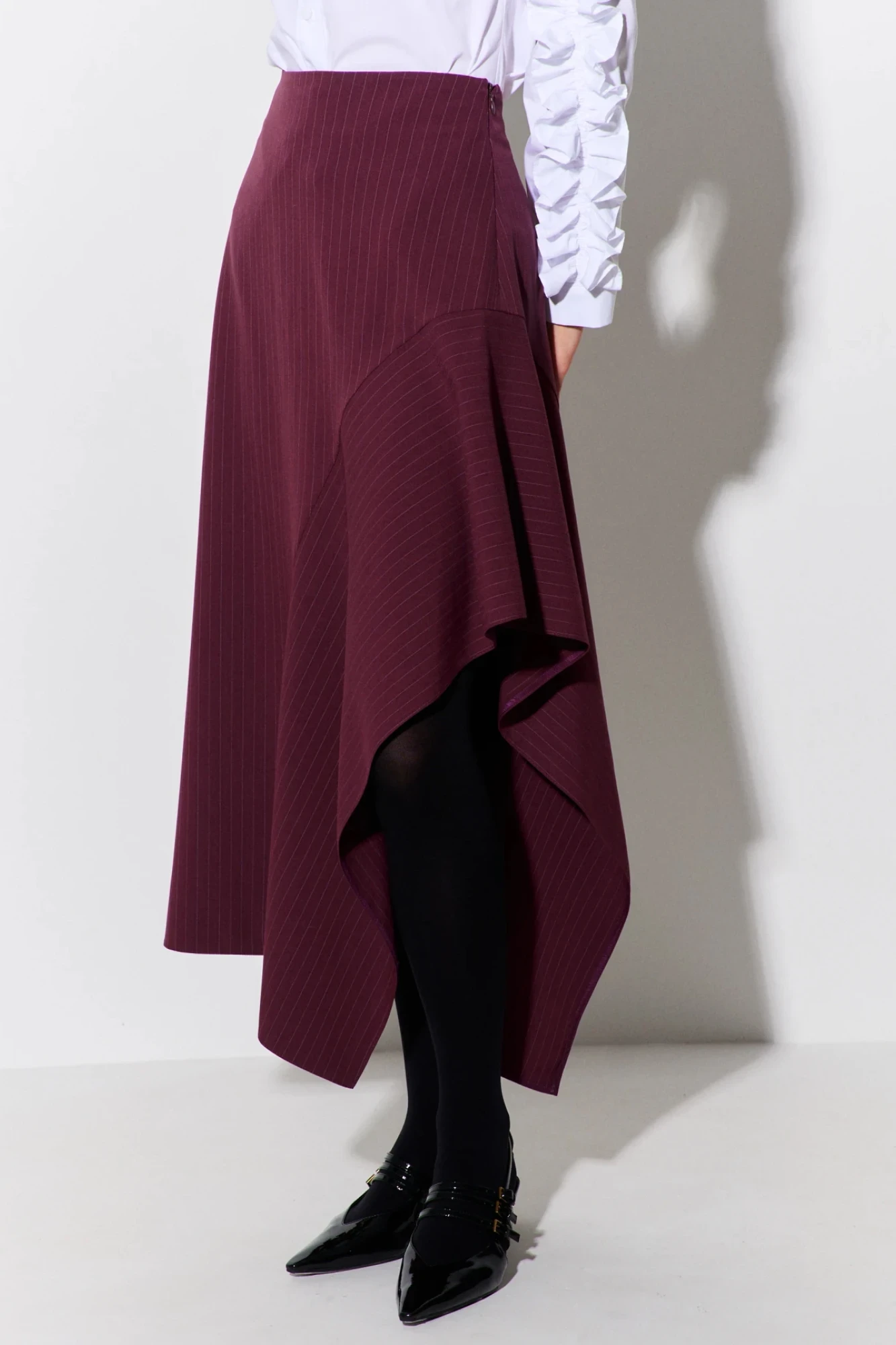 Юбка А-силуэта с ассиметричным воланом выполнена из костюмной ткани в цвете бургунди, застежка-молния по боковому шву, верх юбки обработан поясом с застежкой на петлю и пуговицу. Длина юбки 84 см.