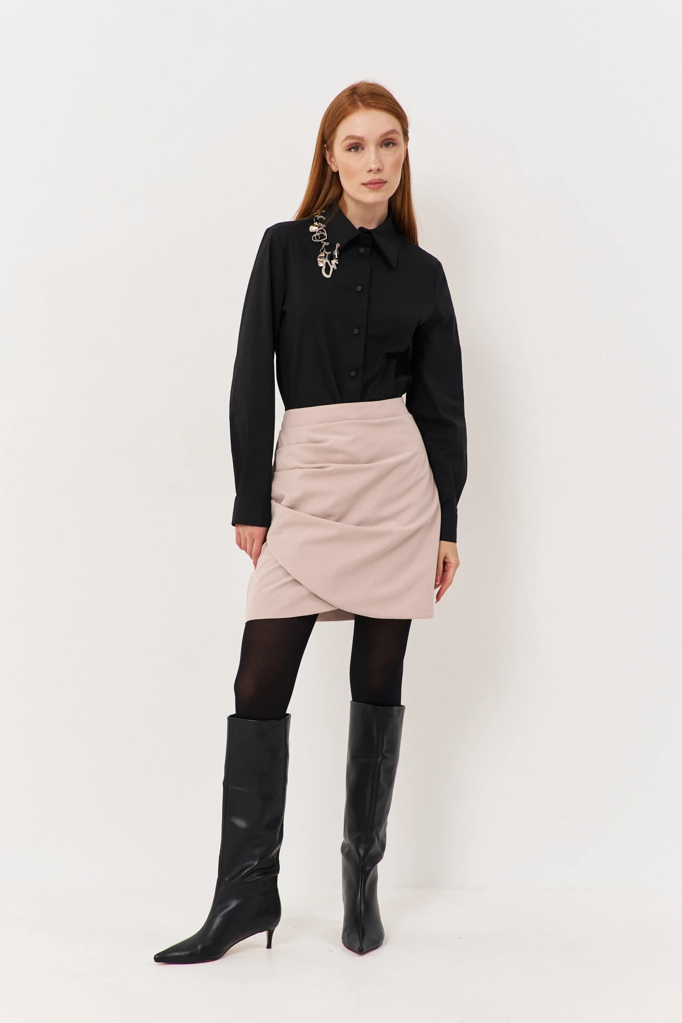 Юбка на запах. Характеристики: выполнена из костюмно-плательной ткани в бежевом цвете, по переду запах и складки, юбка на подкладке, застежка-молния по заднему полотнищу юбки, верх юбки обработан поясом-обтачкой. Длина юбки 46 см.