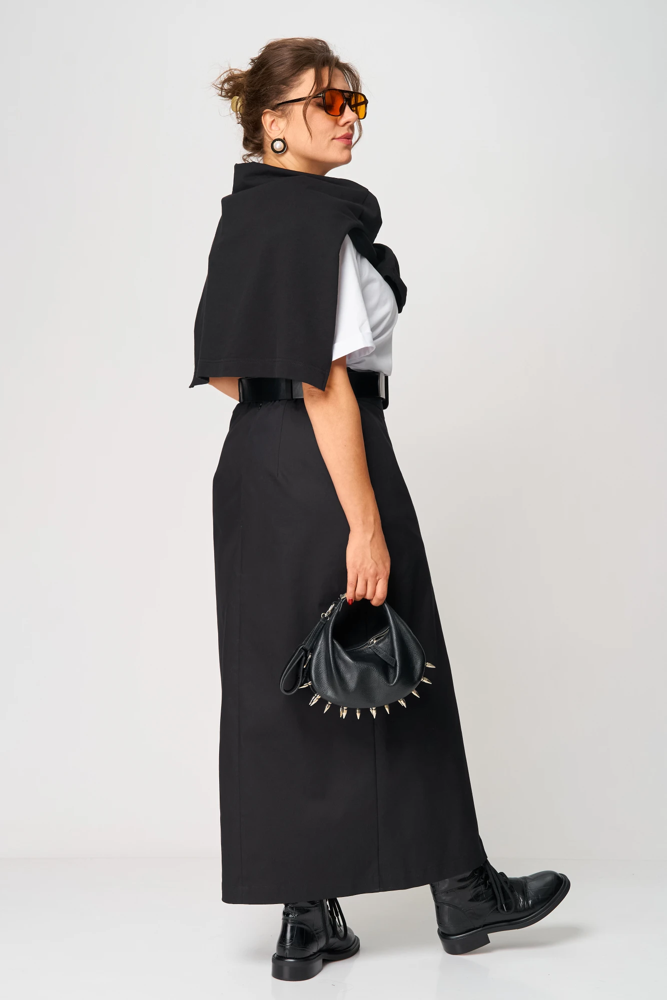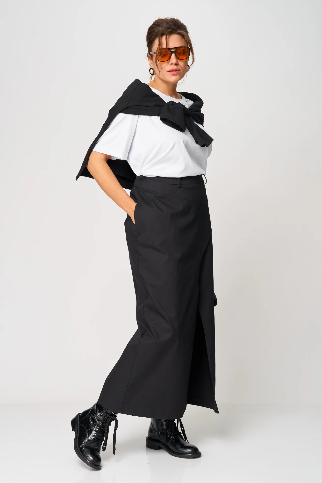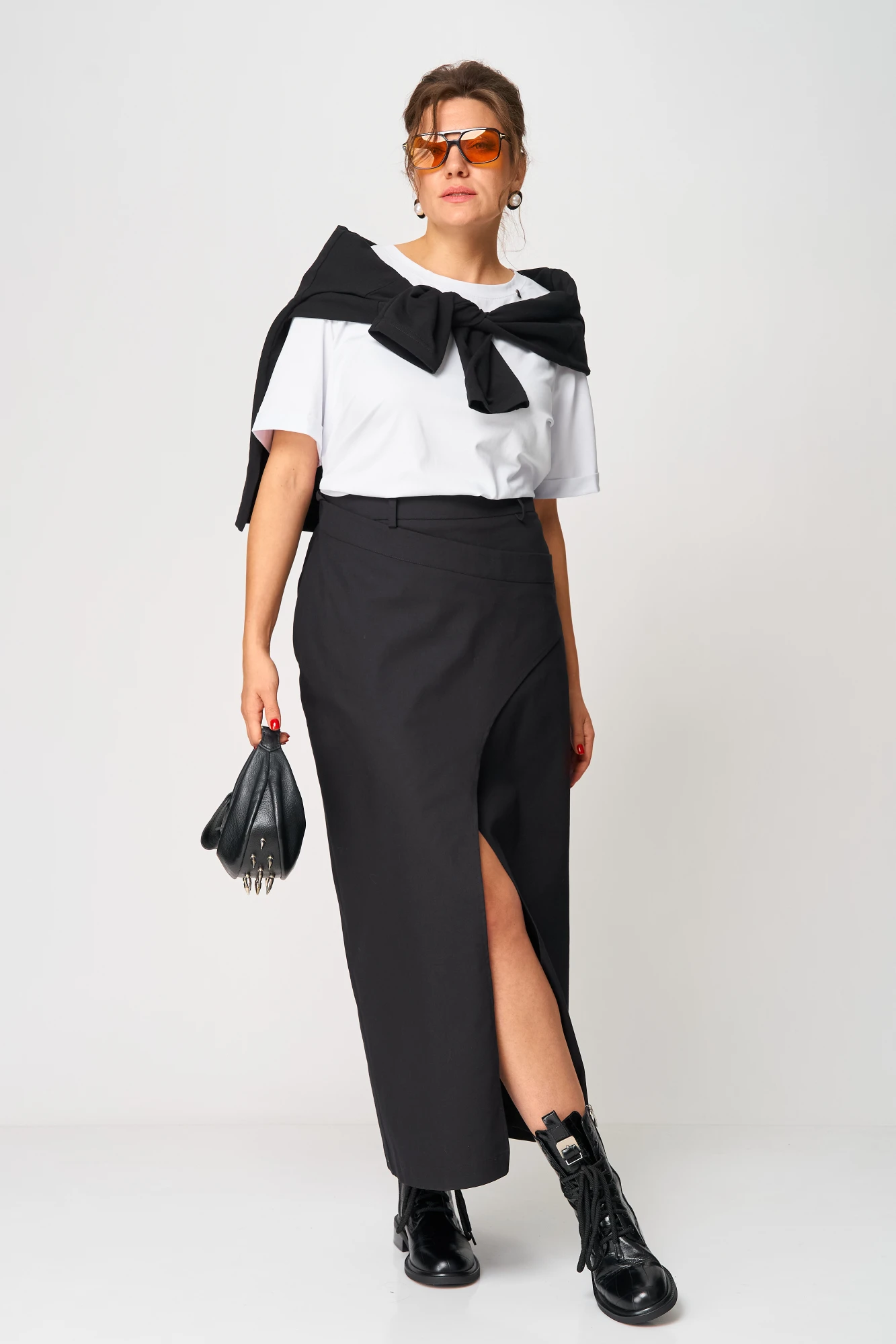 Особое внимание привлекает асимметричный линийный крой и выразительный длинный разрез спереди, который добавляет образу женственность, смелость и лёгкую нотку драматичности. Юбка выглядит одновременно современно, минималистично и очень утончённо, подходит как для будней, так и для особых выходов.