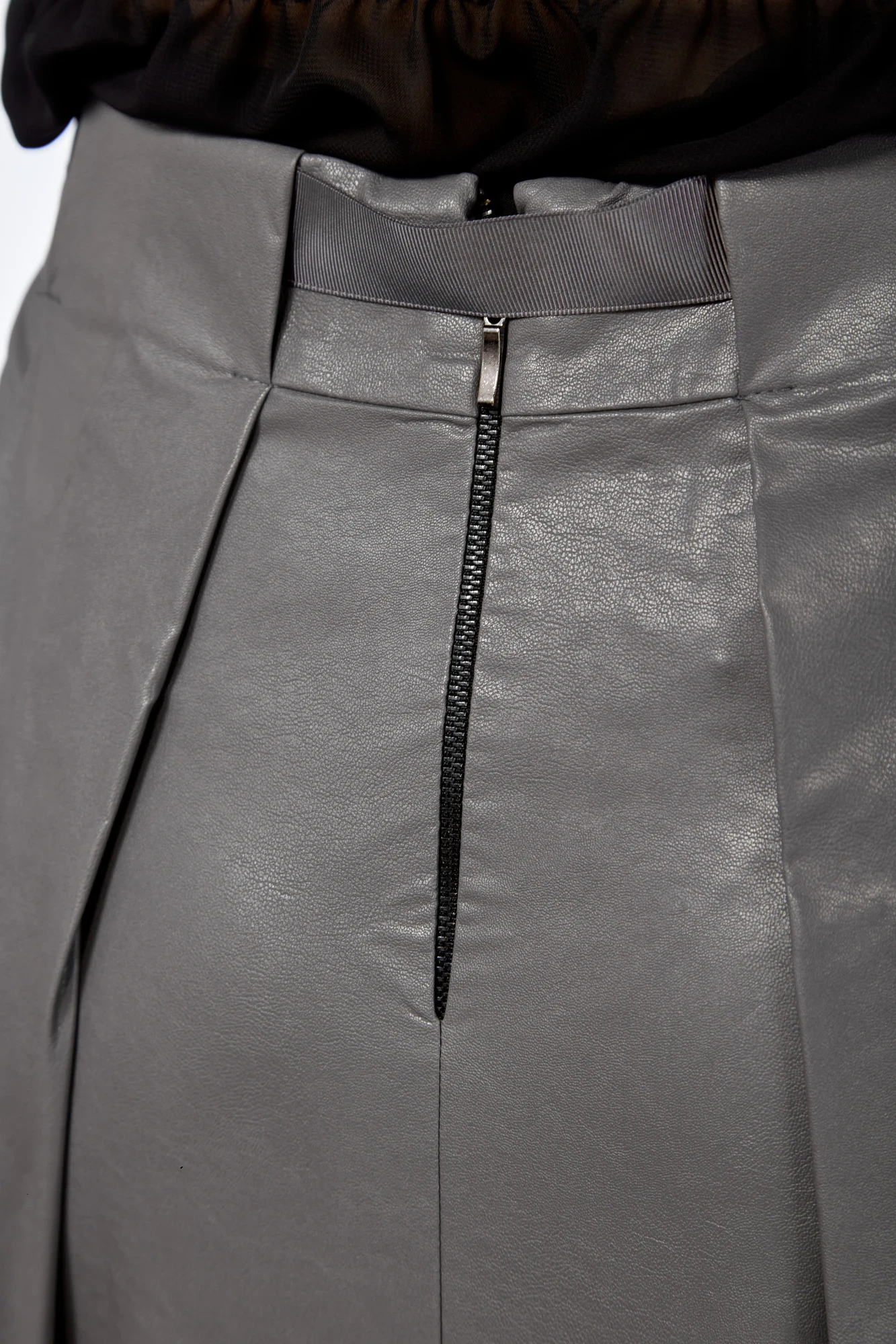 Юбка из экокожи, ткань тянется. Юбка без подкладки. Складки и спереди, и сзади. Есть два действующих кармана. Сзади металлическая молния длиной 18 см. Пояс репсовая лента шириной 2,5 см с металлическими наконечниками.