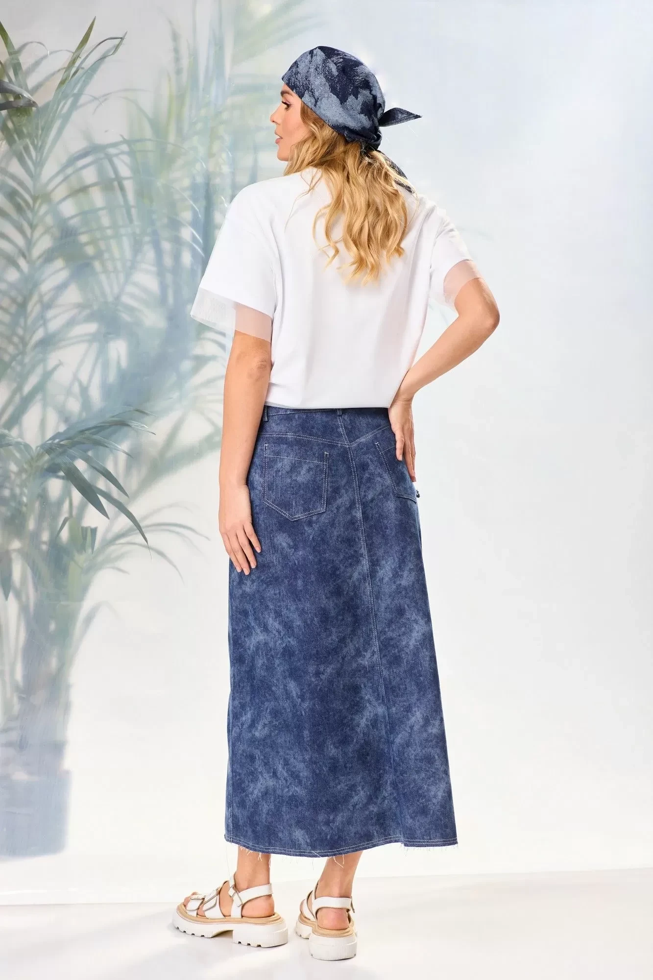 Юбка на талии, плотно облегающая вверху и расширенная к низу, длиной до середины икр, с притачным поясом. Застежка на тесьму-молнию и 1 петлю и пуговицу-«болт». Переднее полотнище юбки со средним швом, который заканчивается разрезом, с рельефными швами, в боковых швах обработаны карманы фигурной формы, на правом бочке расположен «часовой» карман. По боковым обработаны вытачки. Заднее полотнище юбки со средним швом и с кокетками, с 2-мя накладными карманами.