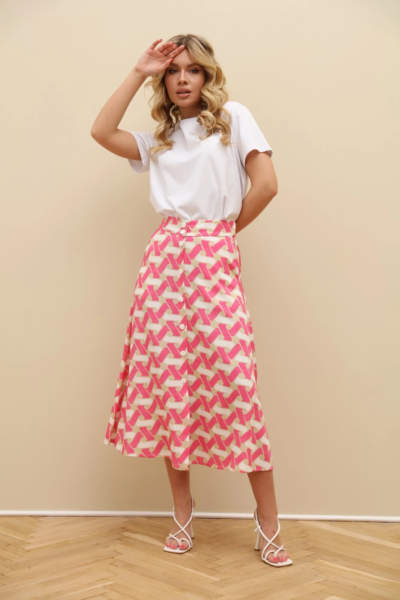 Стильная юбка широкого объёма длины миди. Силуэта юбки – «трапеция». Особенность такой формы - зрительное уменьшение объема талии, бедер и удлинение ног. Эти несомненные плюсы делают модель особенно привлекательной для женщин разного возраста и телосложения. Застежка на пуговицы. В пояс на спинке вставлена эластичная лента. В боковых швах функциональные карманы.