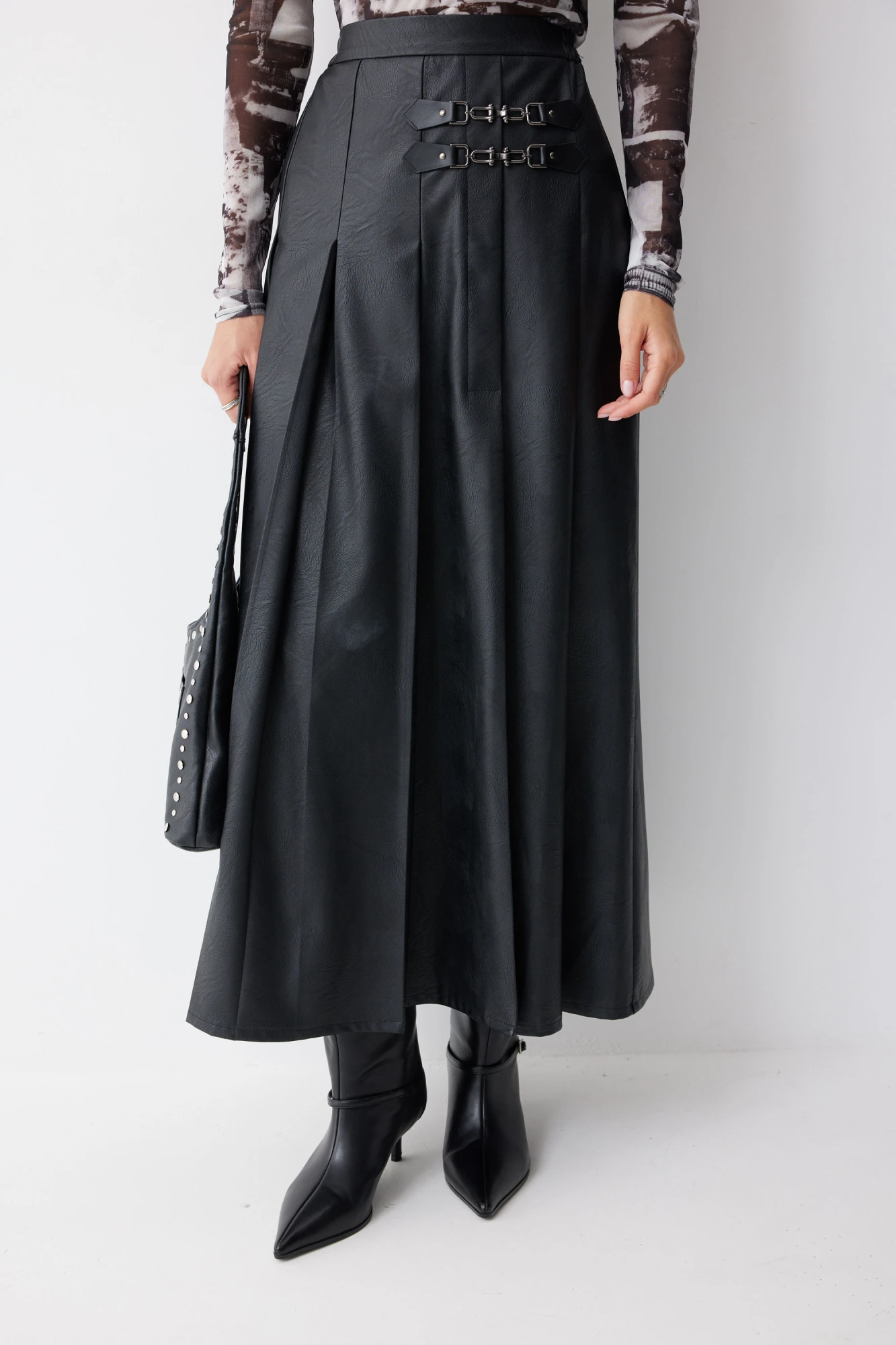 Юбка А-силуэта из экокожи на хлопковой основе длины макси. По верху юбки притачной пояс со шлевками для ремня. Переднее полотнище юбки со складками и шлицей и декоративной фурнитурой. На задних половинках расположены талиевые вытачки. На спинке в центральном шве потайная молния. По бокам в поясе вставлена резинка от складки до вытачки.
