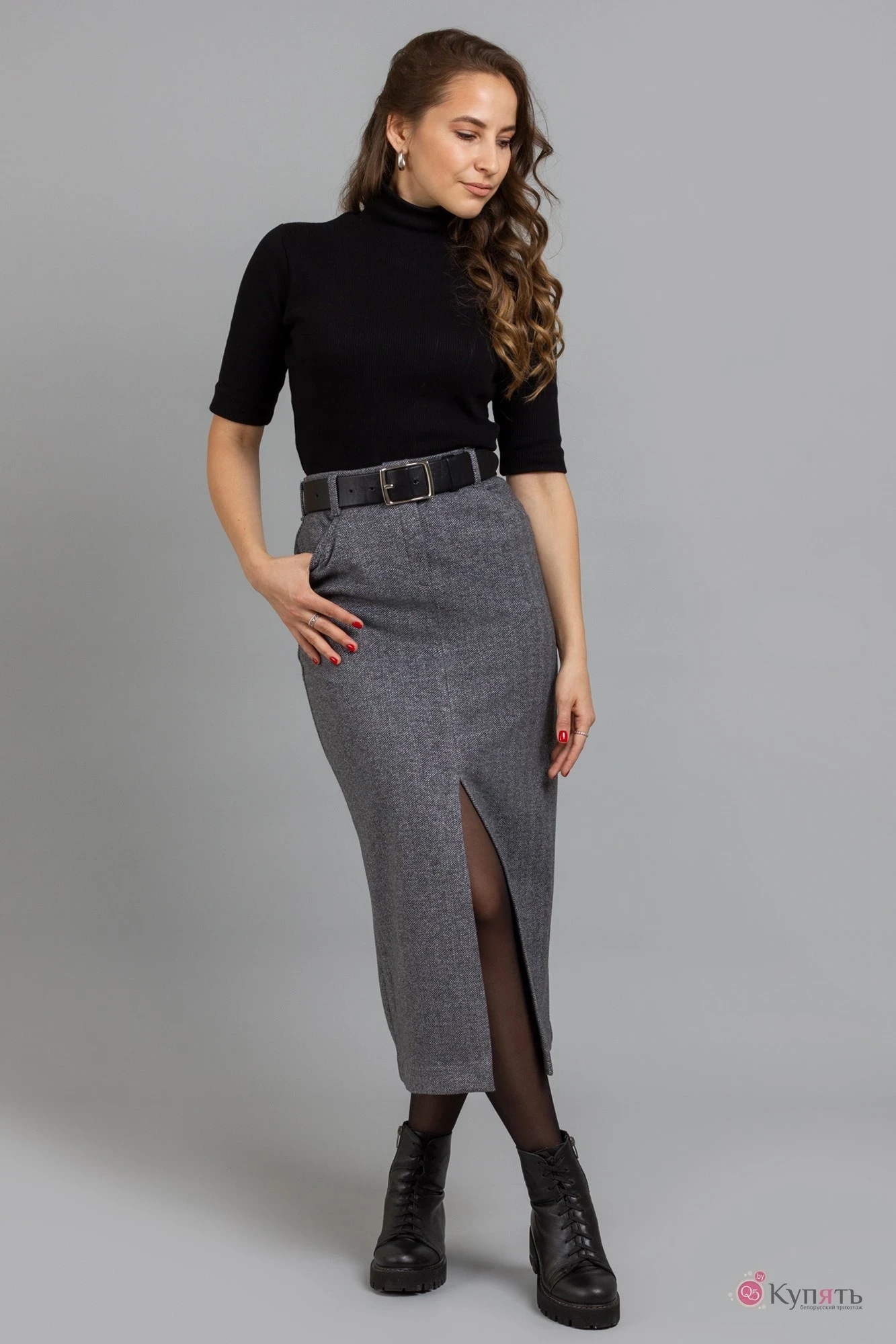 Тёплая Юбка полуприлегающего силуэта длиной миди с притачным поясом, с застёжкой на тесьму-молнию и пуговицу на поясе. На передней половинке внутренние карманы. На задней половинке расположены притачные кокетки с клапанами.