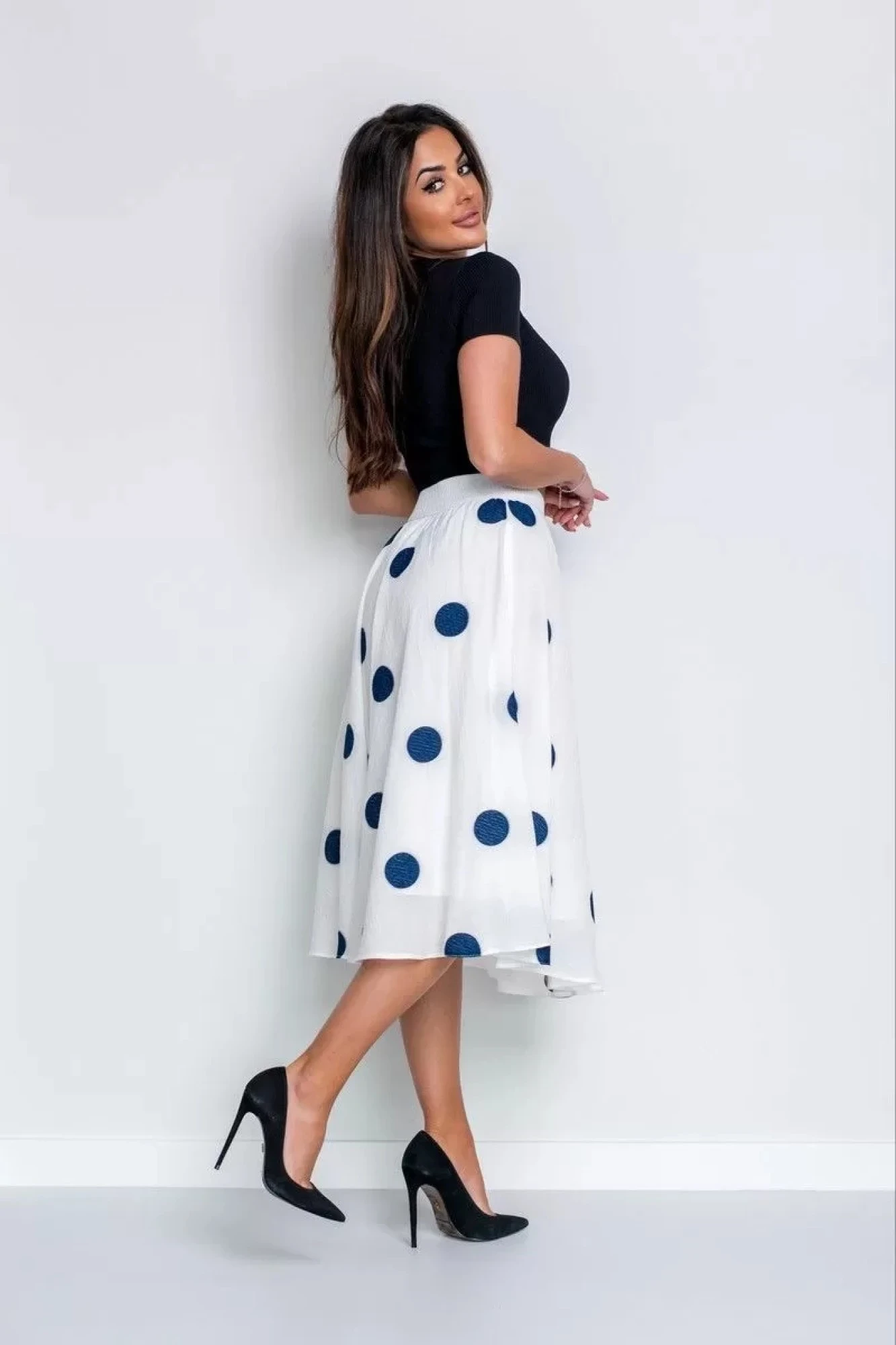 Юбка белая женская или юбка светлая в горошек длиной ниже колена - идеальный вариант на любую пору года. Юбка на резинке отлично подойдет для прогулки по улице и для офиса. Юбка светлая в синий горох на подкладке. Основные изюминки изделия: Юбка женская А - силуэта с притачным поясом на резинке. С тонкой текстильной подкладкой. Из легкого интересного фактурного материала с крупным жаккардовым синим горохом. Женственная, стройнит, не мнется, струится. Визуально вытягивает вашу фигуру и делает стройнее. Деловая и элегантная женская юбка сочетается в коктейльный образ с пиджаком и джемпером так как может заменить брюки.