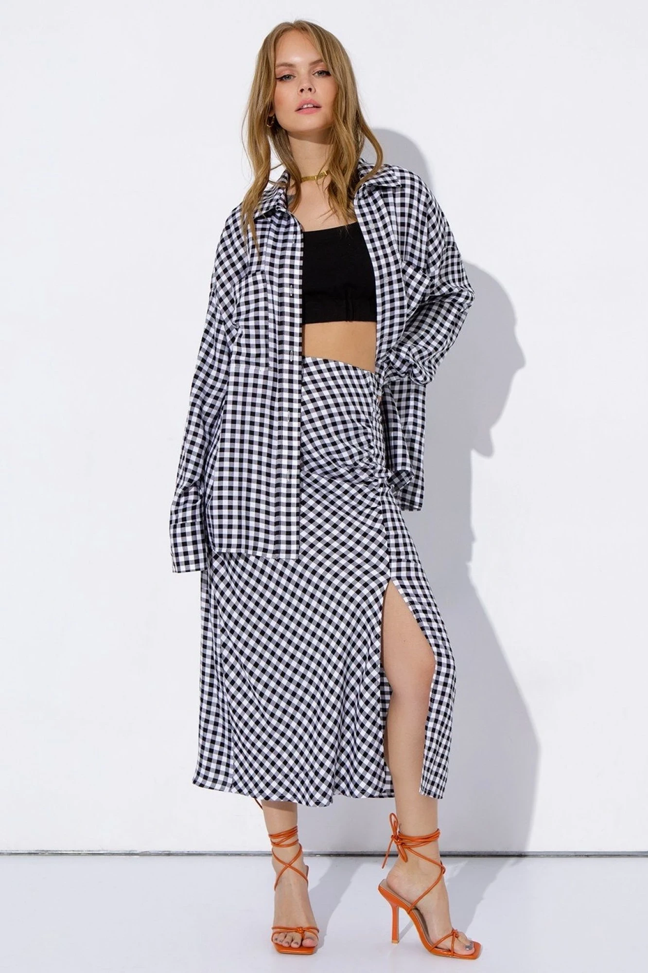 Асимметричная юбка длины миди из принтованной вискозы. Детали: асимметричный крой, высокий разрез, драпировка, пояс на обтачках, средний шов с застежкой- молнией