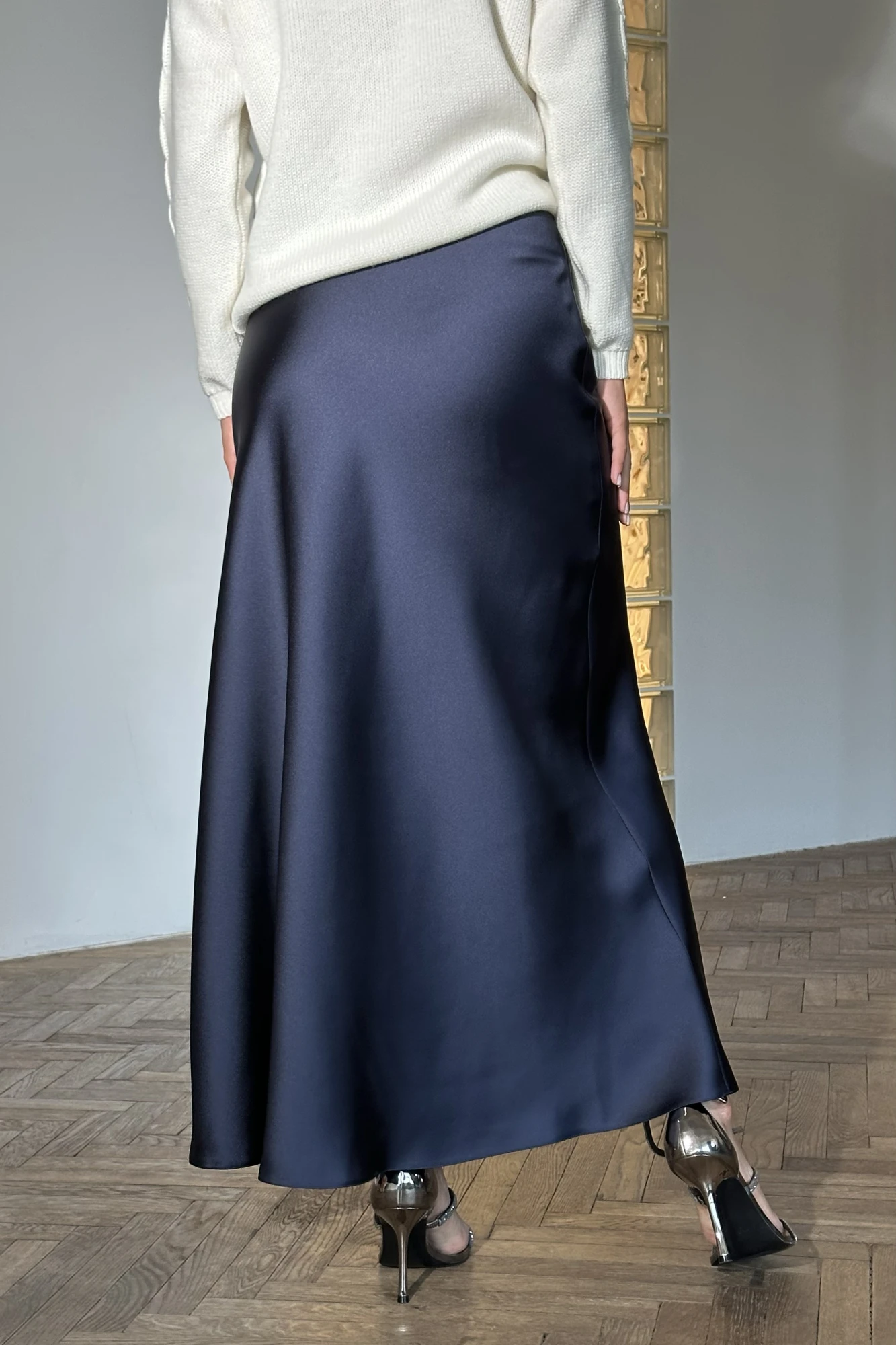 Элегантная женская юбка, А-силуэта длины миди. Посадка высокая, без пояса. Струящаяся блестящая текстура никогда не оставит равнодушной любую женщину.