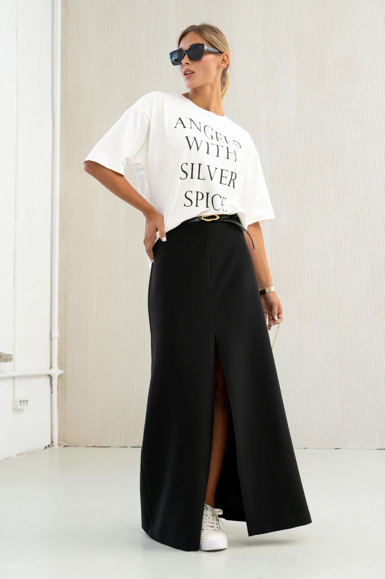 Актуальная юбка-макси, расклешенного силуэта к низу, с разрезом впереди. Застежка - потайная молния в среднем шве задней части юбки. Пояс стабильный с настроченными шлевками. В комплекте с юбкой идет ремень с золотой пряжкой.