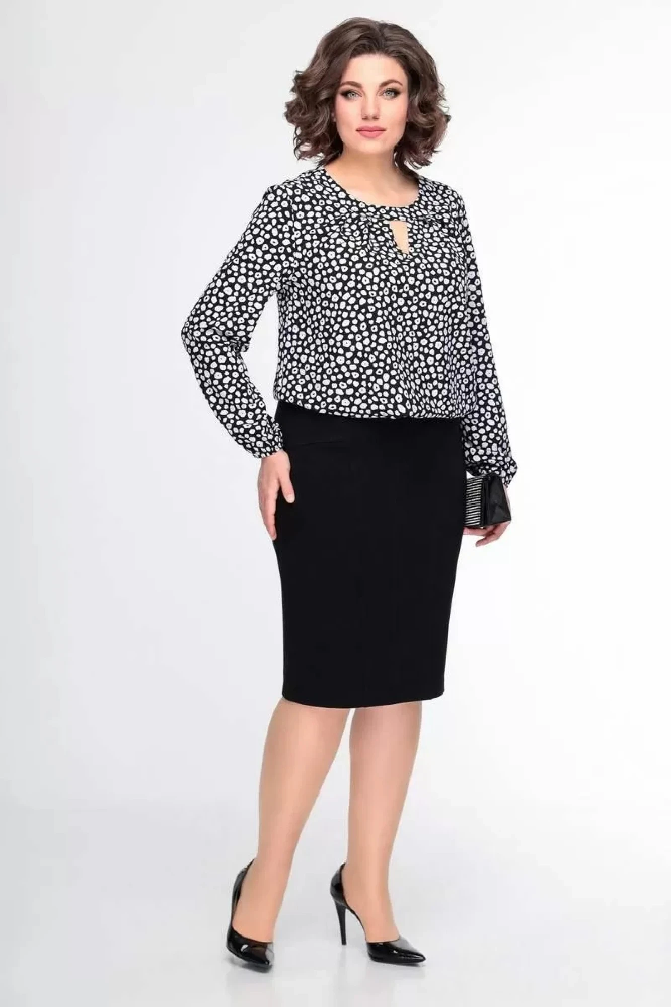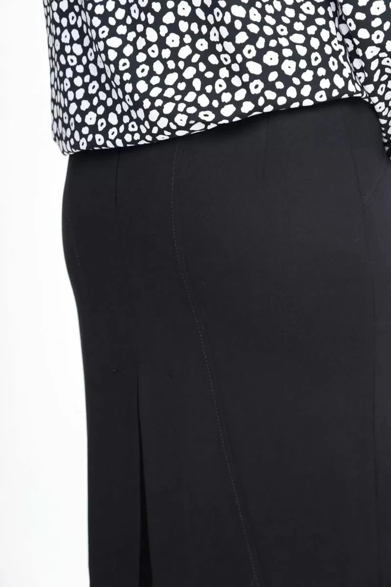 Юбка полуприлегающего силуэта на подкладке. По спинке юбки обработаны вытачки. Застежка на потайную молнию в среднем шве заднего полотнища юбки. Верх юбки обработан обтачкой. В среднем шве разрез. Длина 60 см (±1 см).
