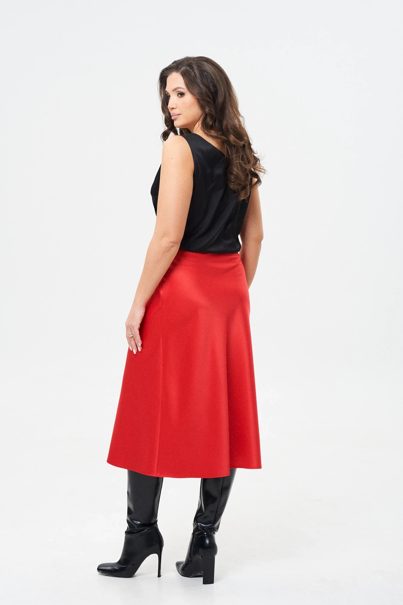 Юбка без подкладки из сатина, по косой, слегка расширенная к низу, с застежкой-«молнией» в боковом шве, верхний срез обработан обтачкой.